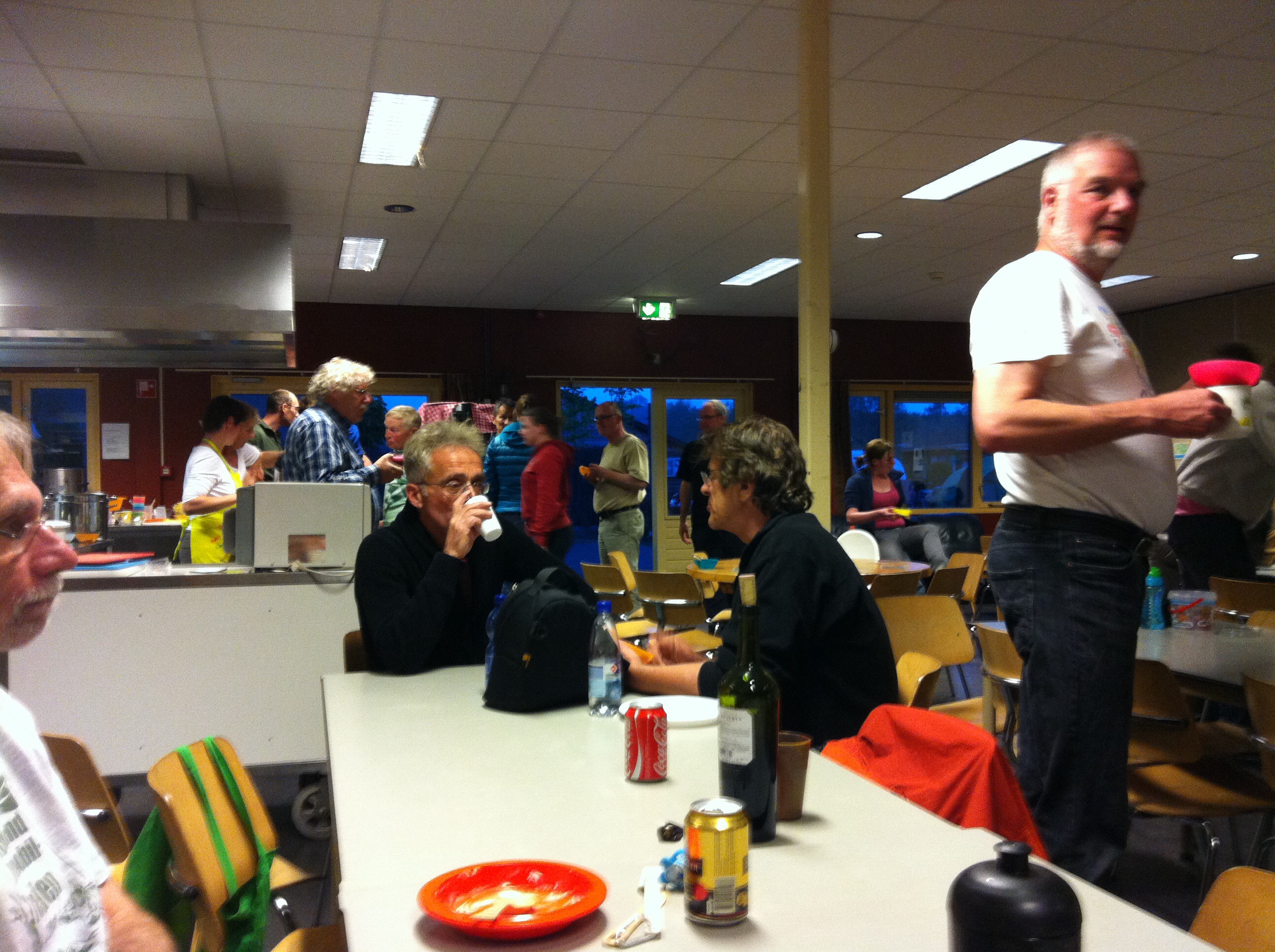Aangekomen bij camping ’t Boerenerf in Woudenberg is iedereen al druk bezig met het bereiden van de gezamelijke pastamaaltijd. Wij willen nog even boodschappen doen in het dorp, spullen voor ontbijt een een wijntje. Dat komt goed uit want de keukenploeg onder leiding van Maartje heeft kruiden nodig dus die kunnen we meteen meenemen. De maaltijd smaakt goed na zo’n fietstocht en dan is er ook nog een toetje met ananas en munt of Irish coffee.