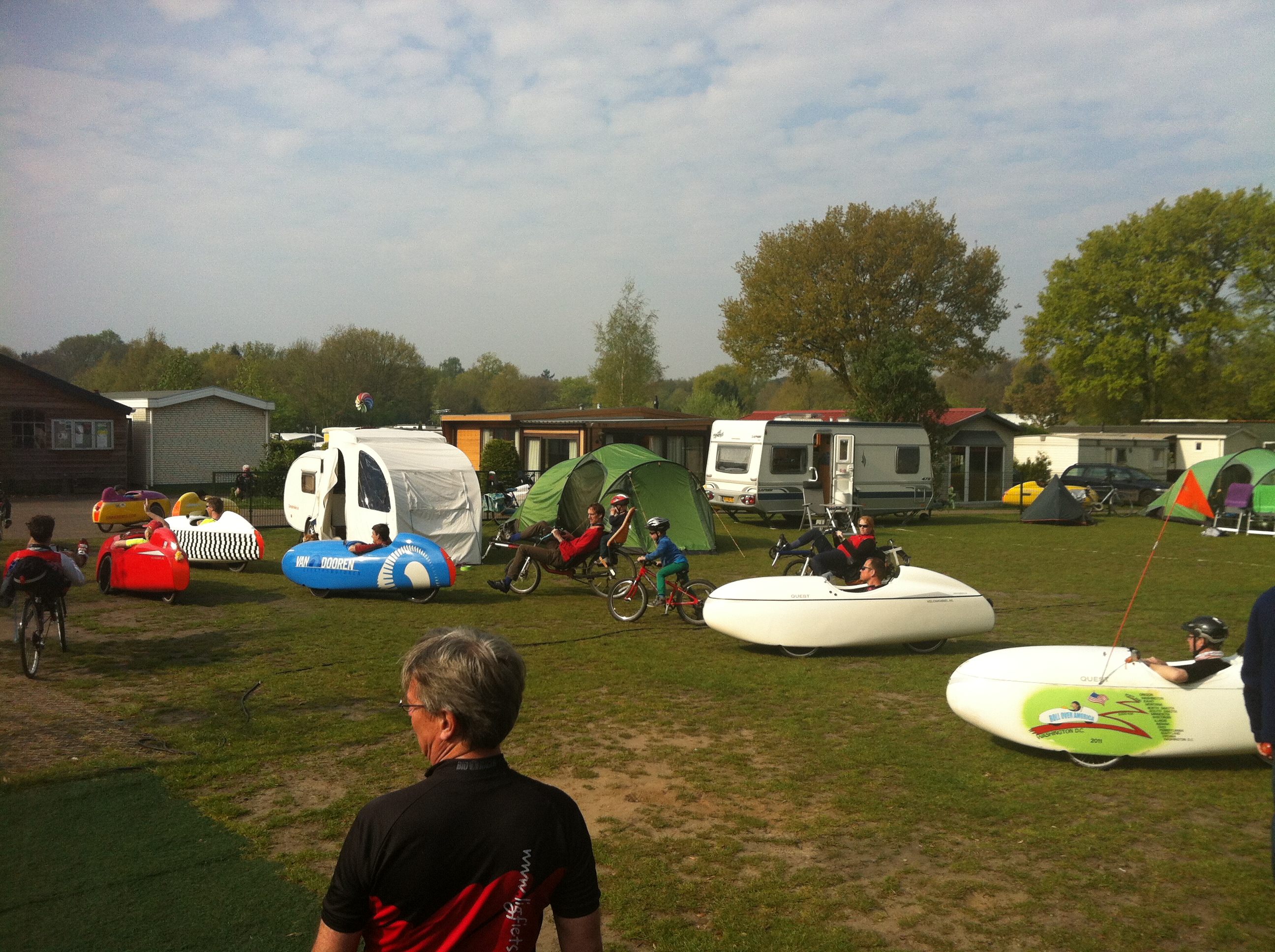 Ligfietsers en leden van de NVHPV (zie ligfiets.net) komen een aantal keren per jaar bij elkaar. Een van die bijeenkomsten is het zogeheten Paastreffen, dit jaar in Woudenberg. Het is mooi weer, dus een groot aantal ligfietsers heeft een tentje meegenomen. Wie dat niet wil, kan slapen in een van de slaapzalen in een stapelbed.