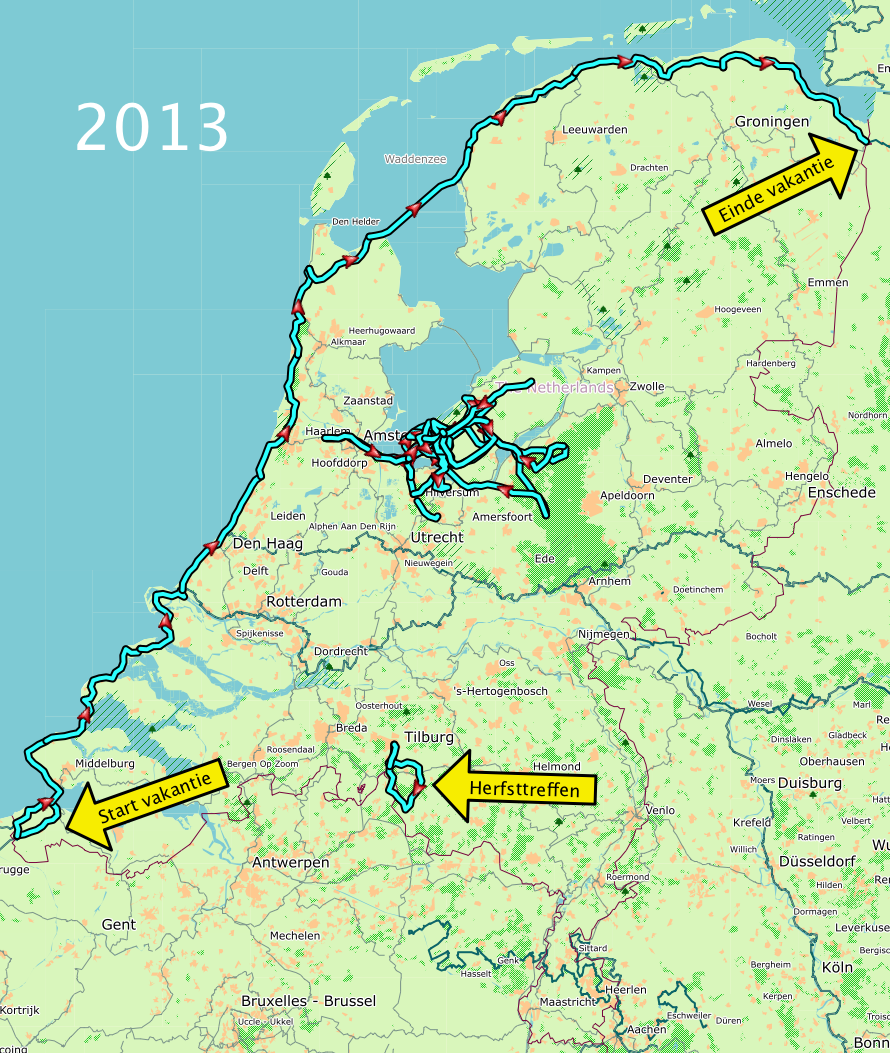De kaart van 2013 laat een heel ander beeld zien. In totaal 1880 kilometer, dus ruim 1000 kilometer minder dan dit jaar. Terwijl we vorig jaar een ligfietsvakantie (de Noordzeekustroute LF 1 en LF 10) hebben gedaan en dit jaar niet.