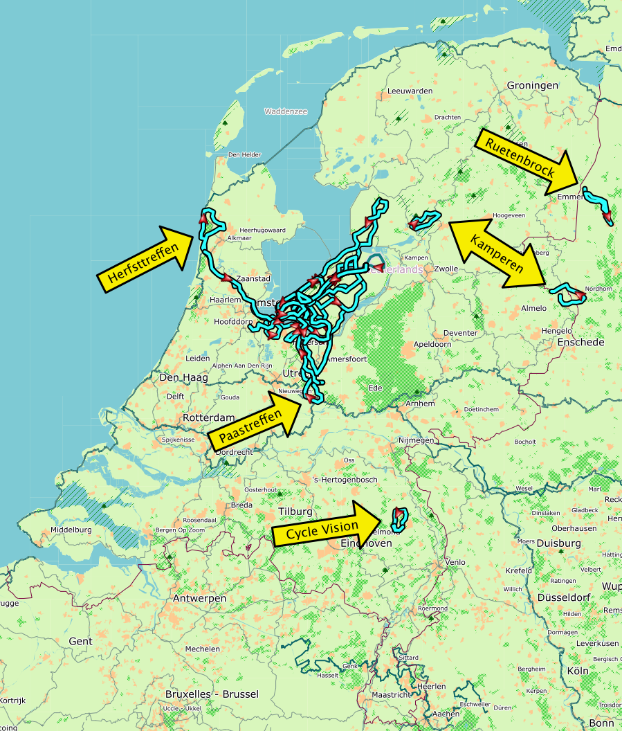 Uit de tracks op de kaart blijkt dat de meeste tochten vanaf huis ondernomen worden. Losse krullen komen voor rekening van de open liggers: die werden per trein of op het dak van de auto meegenomen. Dit voordeel van de open ligfietsen blijft wel: ze kunnen beide mee op het dak van de auto, voor tochtjes die eens niet bij huis beginnen.
