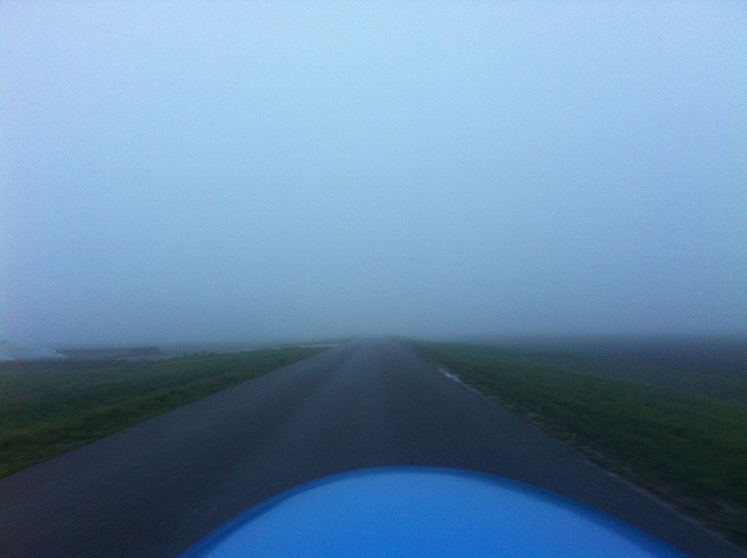 Volgens Weeronline zou het in de middag wat opklaren maar het bleef de hele dag mistig. Bij vertrek was het 6 graden en het waaide nauwelijks. Al snel bleek dat geen van onze anti-fog brillen bestand was tegen zoveel mist. Zelfs Dave’s bril met dubbele beglazing was niet bestand tegen zoveel vocht. Ook mijn Julbo Whoops die niet winddicht is en mijn winddichte Adidas-bril doorstonden de test niet.
