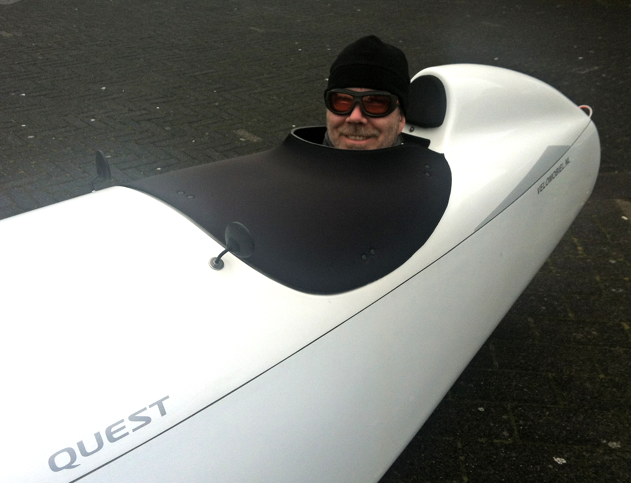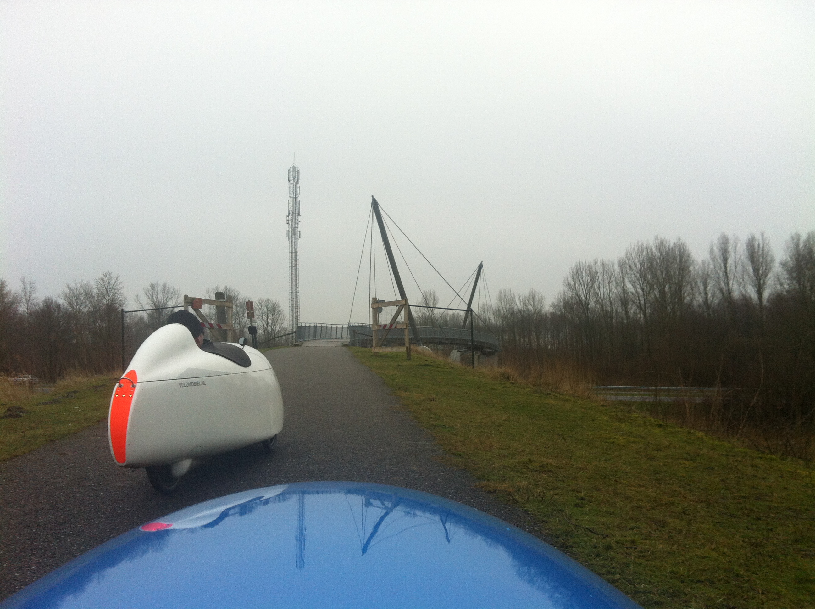 De velomobiel hobbelt over het ijs, de drie wielen pakken om beurten een ander spoor in het ijs op en het lijkt daardoor wel alsof de wielen niet meer met elkaar sporen. Ik verlaag mijn snelheid naar 18 kilometer per uur, want af en toe heeft de staart de neiging om uit te breken en dwars te gaan op de weg, toch corrigeert de fiets zich weer goed. Af en toe is de fiets echt onbestuurbaar en glijden we op drie wielen. We zien mensen fietsen op twee wielen, we hebben het met ze te doen. Als ze omvallen vallen ze ook nog een heel eind naar beneden. We willen niet ruilen.