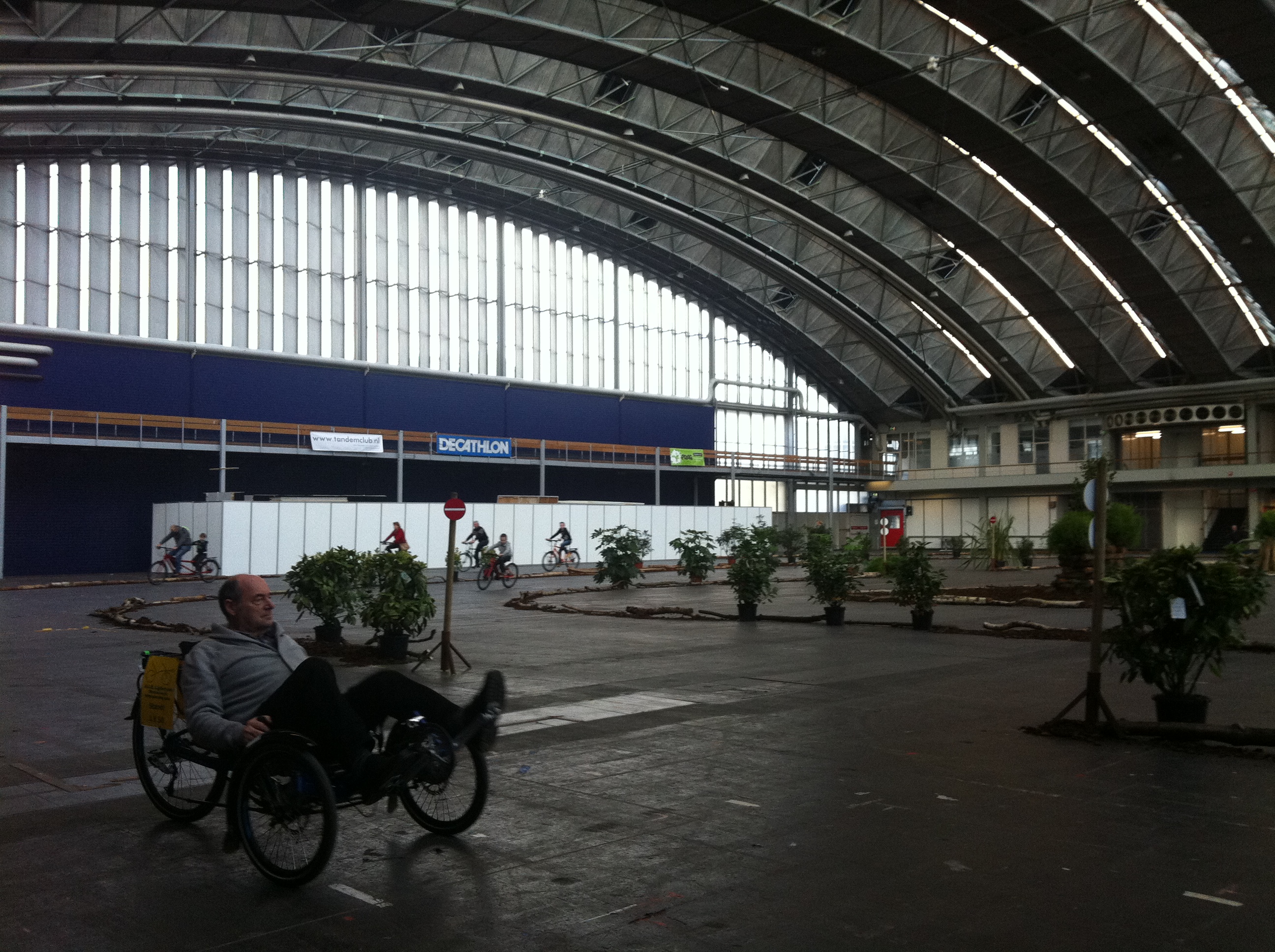 Na de gaderobe gingen we eerst maar eens op zoek naar koffie. Die dronken we met zicht op het fietsparcours dat uitgezet was in hal 1 van de RAI te Amsterdam. Dat was een beetje met gevaar voor eigen leven want je zag dat veel mensen moeite hadden met fietsen op een ligfiets. De medewerkers van A.C.E. renden de benen uit hun lijf om de aspirant-ligfietsers te behoeden voor vallen. Er waren onder andere ook een fiets met zijspan, trikes, Santos-fietsen en e-bikes om uit te proberen.
