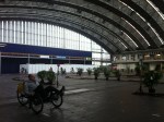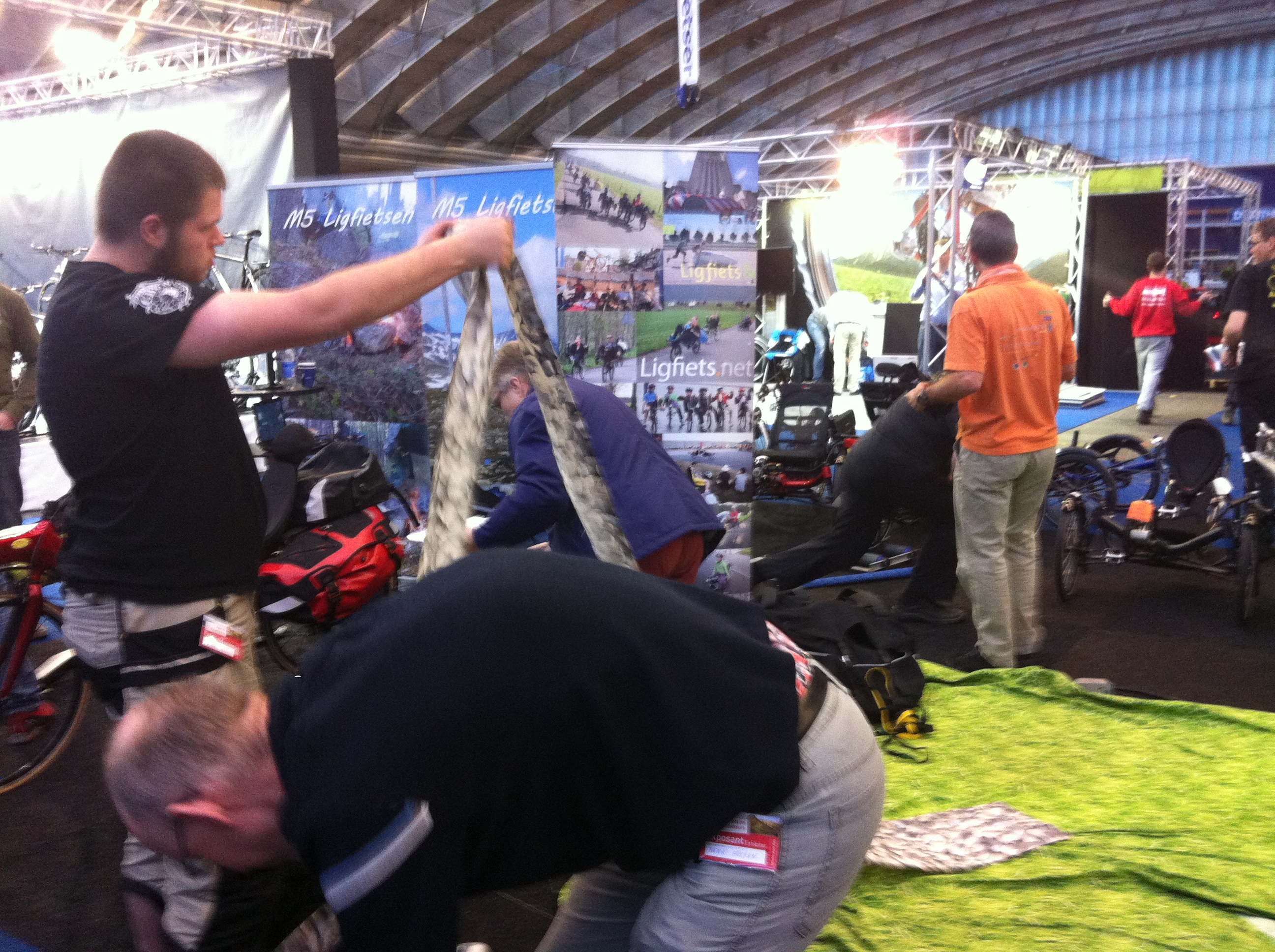 Om vijf uur veranderde de beurs in een chaos: alle standhouders gingen afbreken. De stand van Velomobiel was het snelste klaar. Foldertjes, laptop en schaalmodel gingen in de velomobiel, doekje van het klaptafeltje erbij en wegrijden met de fietsen.