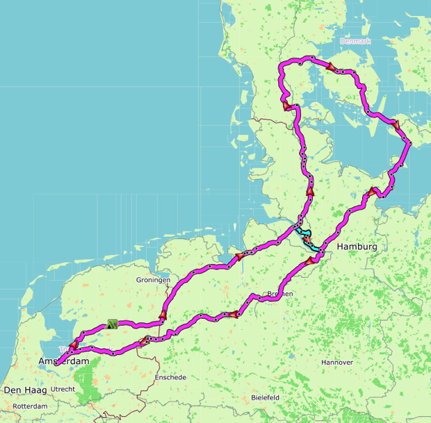 We hebben een afsteekje gemaakt langs de Elbe (lichtblauw op de kaart) voor als de totale afstand onhaalbaar blijkt door omstandigheden als gezondheid, materiaalpech, slechte wegen of iets anders onvoorzien. Als we het afsteekje nemen is de route 889 kilometer. We besluiten om geen officiële routes als de North Sea Coast Route, Baltic Sea Route of de Jutland-route te volgen maar onze eigen weg te gaan. Die toeristische routes bevatten ons teveel omwegen, (half) onverharde stukken, klaphekjes of te smalle paden. De Oostzee-route van Bikeline vormde wel de inspiratie voor deze tocht. De weg valt in Denemarken goed te controleren met Google Street View, voor Duitsland moeten we terugvallen op Google Earth.