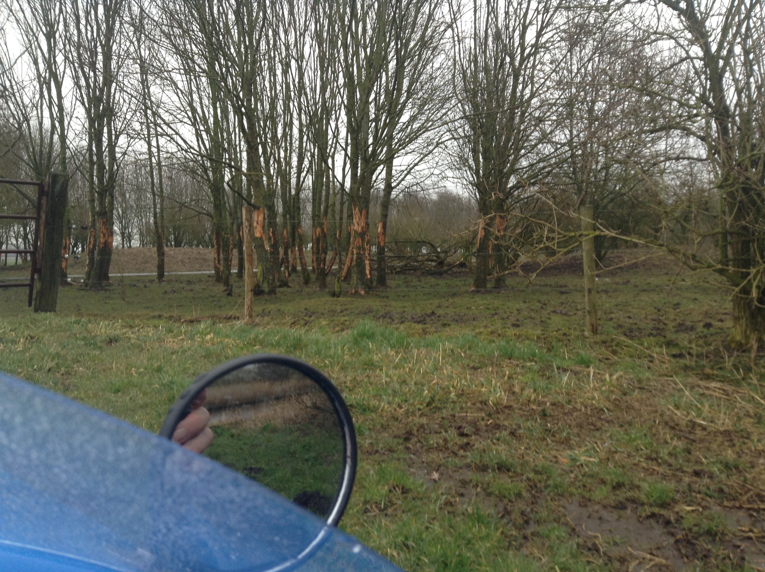 Langs het pad met de drie paaltjes waren alle bomen aangevreten door de reeën. De dieren zelf zag ik vandaag niet. Wel paarden die daar vrij lopen, gelukkig stonden ze een eind van het pad af want deze paarden zijn zo nieuwsgierig dat ze een velomobilist de weg versperren. Wel kon ik weer door bergen paardenpoep rijden. Het fietspad maakt onderdeel uit van een knooppuntenroute maar gezien het aantal graspollen op het wegdek krijg ik het vermoeden dat meer fietsers de combinatie fietspad-bergen paardenstront niet zo geweldig vinden en het pad mijden.
