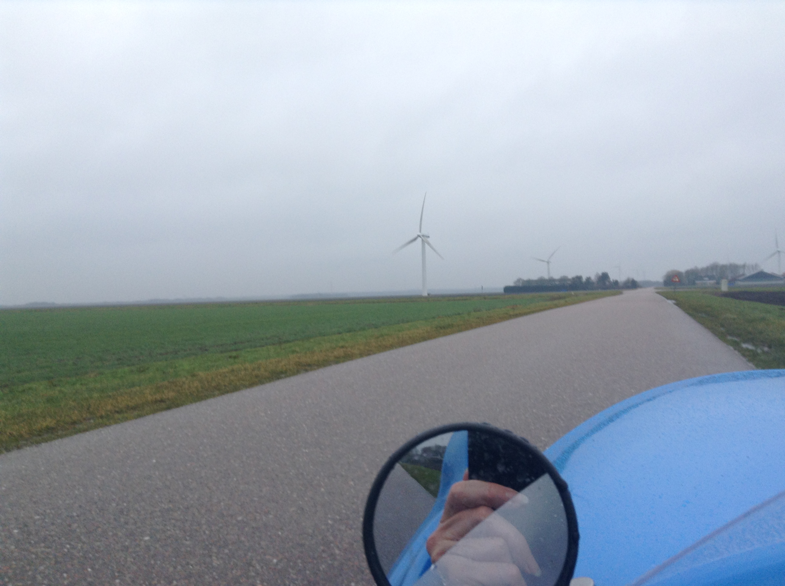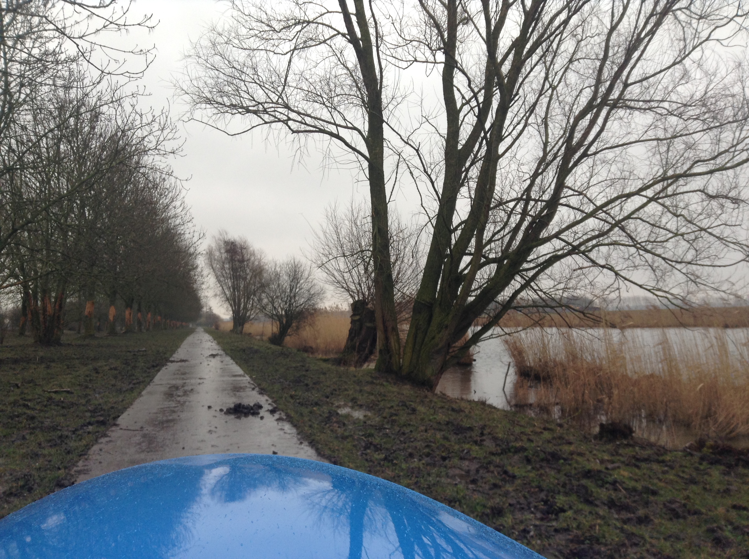 De nieuwe wasdroger werd bezorgd en de oude meegenomen. De nieuwe buitenband zat er op en ook de schoenen waren bedrijfsklaar. Eindelijk waren we gereed om te gaan fietsen maar het was inmiddels half vier. En winderig en miezerig. Een kort rondje dus. Even checken of het pad bij de Tureluurweg na mijn melding bij de Fietsersbond al ontdaan is van zijn drie paaltjes waar je met fietstassen of een driewieler nauwelijks langs geraakt (ze stonden er nog).