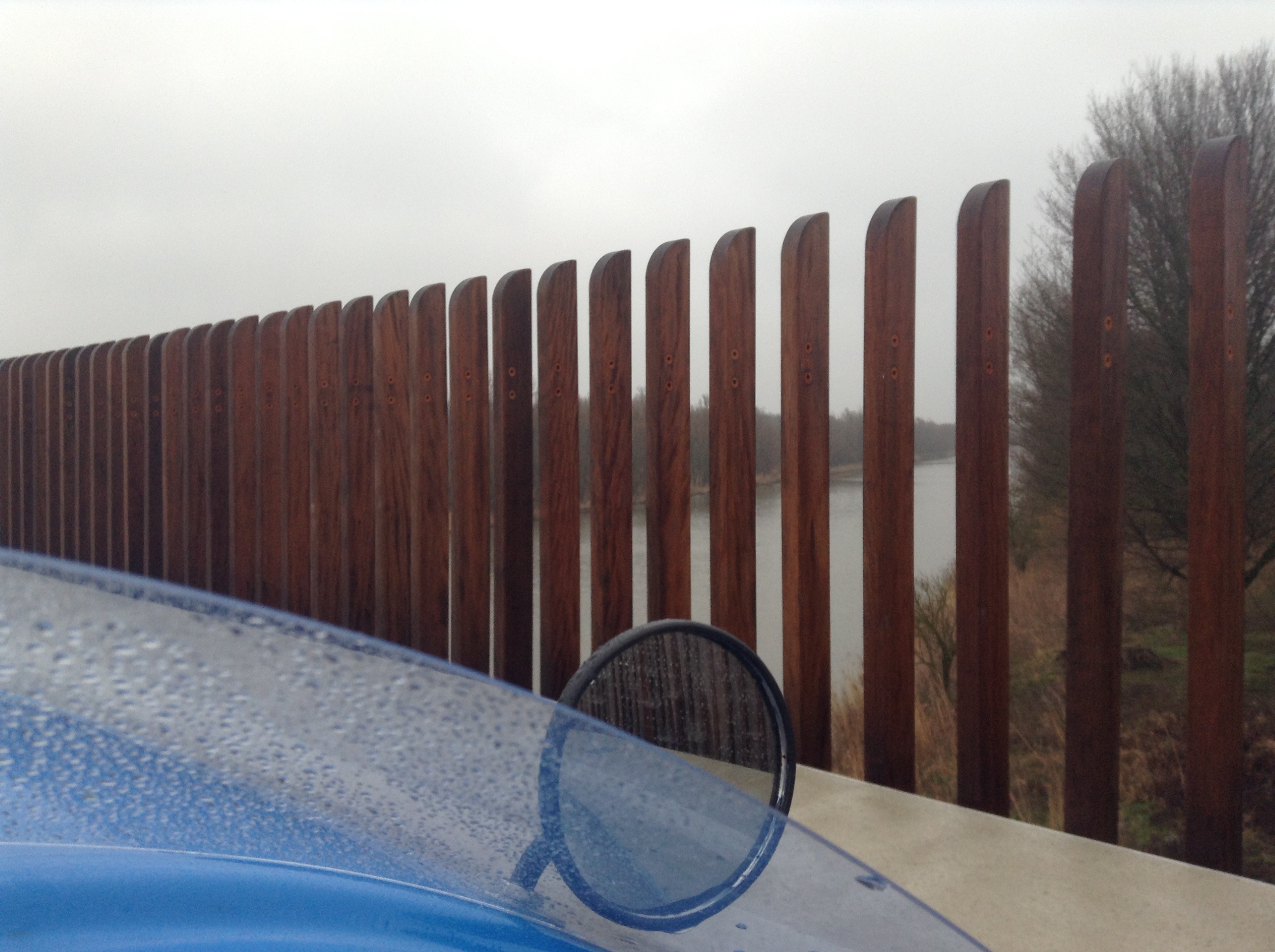 Nieuwe fietsbrug over de A6 en Hoge Vaart waar de RVS-reling van gestolen is (zie de schroefgaten in het hout) – (klik eventueel op de foto voor een vergroting)