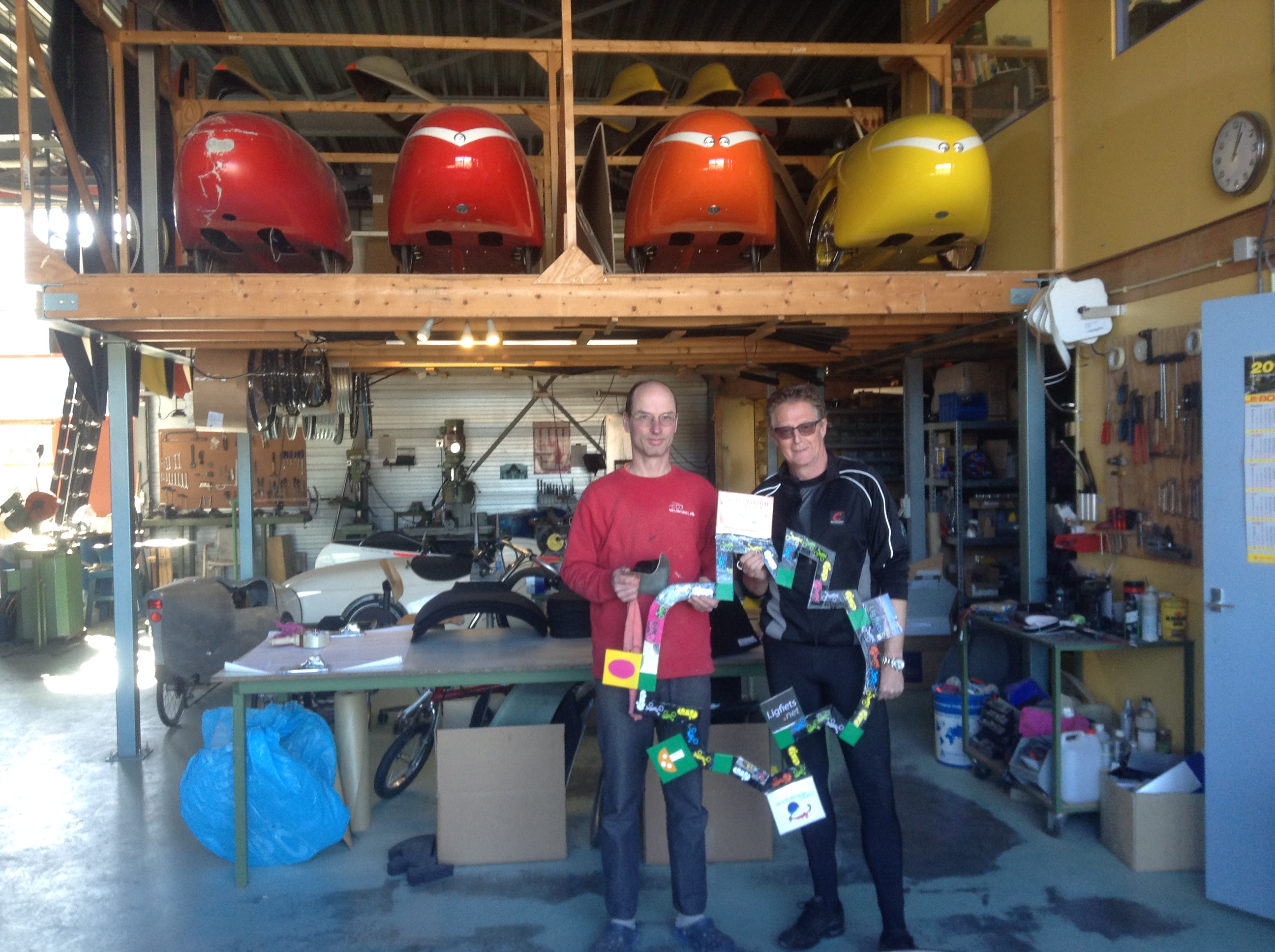 Toen ik de opgevouwen krans uit mijn fiets haalde op de stoep voor Velomobiel.nl zei George: “Is dat het ding?” Hij wilde het eerst niet geloven. “Maar je hebt toch de foto gezien in m’n blogpost over het estafette-ding?” George: “Ja maar ik dacht dat dat een grapje was.” Eh, nee dus.