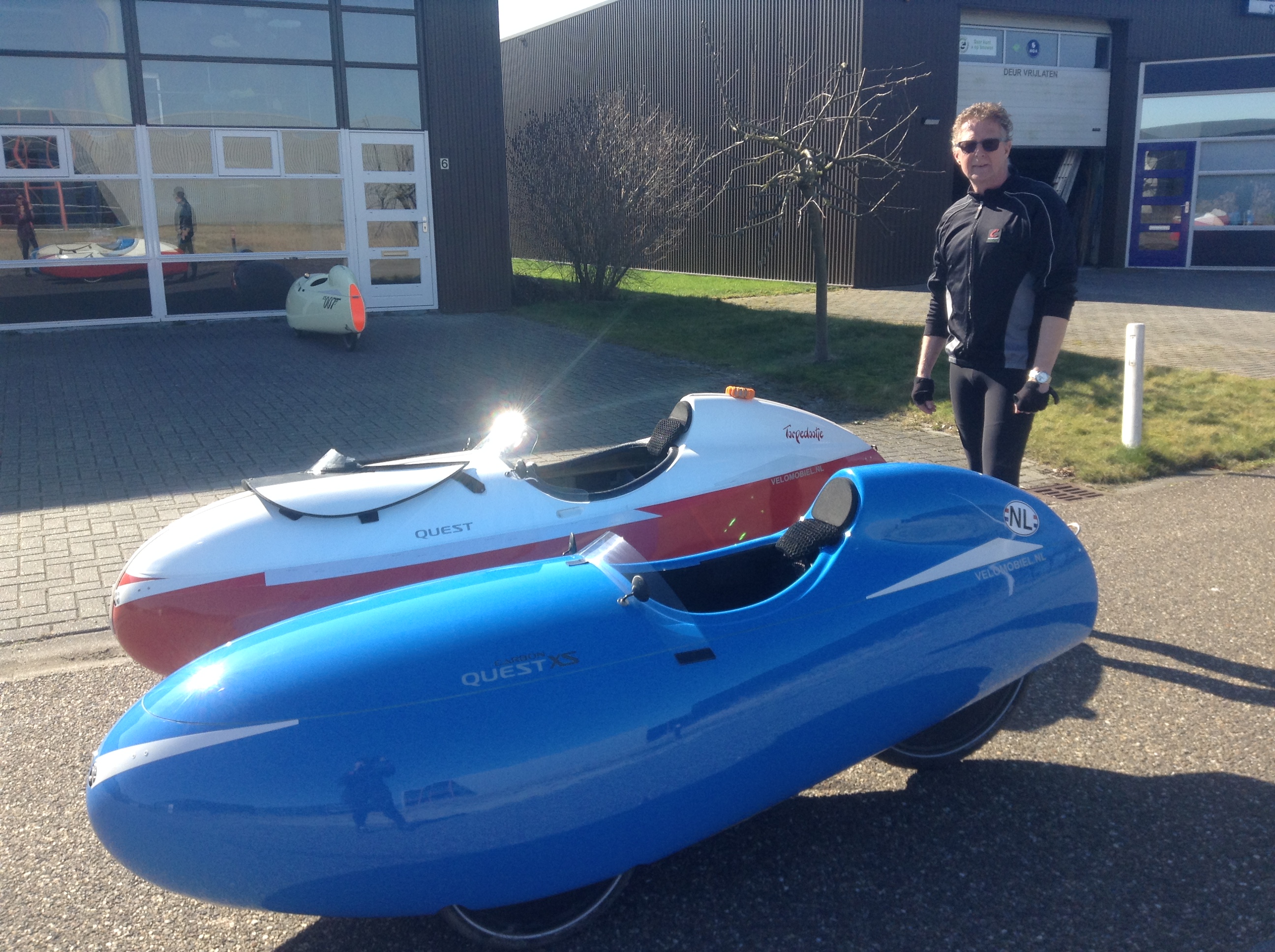 George met zijn rood-witte Torpedootje en mijn blauwe Quest XS #108 voor het pand van Velomobiel.nl.