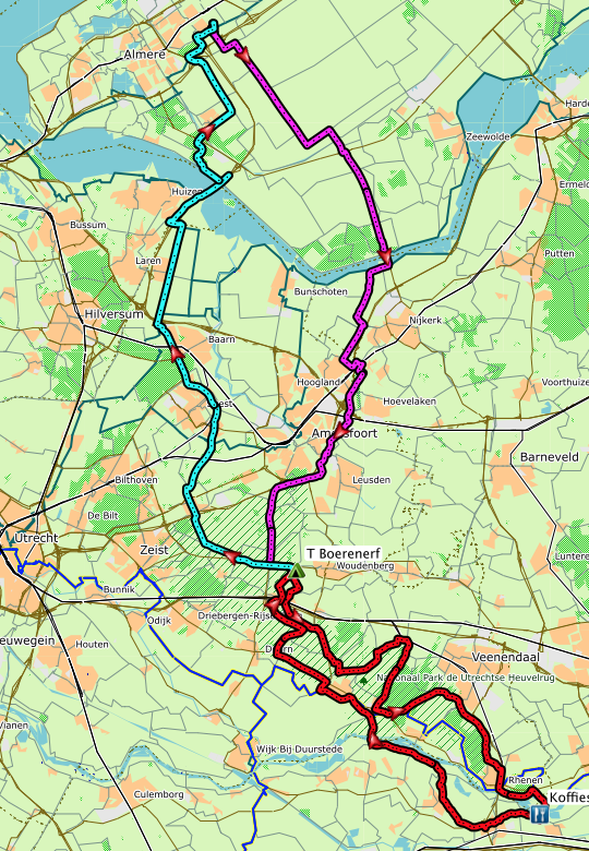 De heenweg (magenta op de kaart) laat ik uitrekenen door de Fietsersbond routeplanner. Wanneer ik al mijn opties aanzet: vermijd alle obstakels en de obstakels voor lange en brede fietsen worden de 52 kilometer er opeens 85. Laten we eens gek doen, ik selecteer de racefietsersvariant. Ben benieuwd waar die ons brengt. De terugweg (cyaan) is ongeveer even lang en dezelfde als die we vorig jaar gefietst hebben, deze heb ik zelf geplot in Basecamp. Ik check nog wel even snel of er geen half verharde paden in voorkomen, met een velomobiel toch een stuk minder prettig dan met een open ligfiets. We kiezen voor de lange toertocht op zondag, van 74 kilometer (rood).
