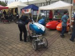 Omdat ik ook een artikel zal schrijven voor Ligfiets& wil ik niet teveel al prijsgeven. Het was ondanks de weersverwachting onverwacht erg mooi zonnig t-shirtweer. Dat was fijn omdat de beurs voor een deel ook buiten plaatsvond met twee verschillende testparcours en een buitenmarkt waar Velomobiel.nl en Flevobike onder andere stonden.