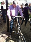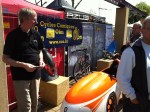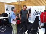 Vrij lang gesproken met de broers Vrielink van Flevobike over de bakfiets die zij hebben ontwikkeld voor DHL: de Armadillo (primeur!) en over de volgende Orca (primeur! Lees de volgende Ligfiets&, een prachtig blad dat naar leden van de NVHPV gratis wordt toegestuurd). Veel bekenden tegengekomen: Wim Schermer (zonder VeloTilt), Gerrit Tempelman (die in zijn bus overnachtte), Harry Lieben die een soort Mango-stand buiten het hek had. Veel bezoekers kwamen met hun eigen fiets en waren die ook een beetje aan het showen, dus heel gek was dat niet, dus waarom dan ook geen foldertjes uitdelen (behalve dat het niet mag van de organisatie). Harry had de 650 kilometer vanuit Groningen in drie dagen gefietst, met op de eerste dag een etappe van 280 kilometer. Mike Burrows stond er met zijn Windcheetah fietsen op een stand en ook Henk en Monique van Nazca waren aanwezig met hun beursstand.