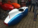 We hebben uiteraard de carrosserie van de Quattrovelo mogen zien (primeur!). Fantastische grote laadruimte achterin en eindelijk konden we ook eens de smurfenmuts op de fiets zien. Er zaten wel wielen onder de Quattrovelo maar verder nog geen frame, wielkasten, stoeltje of iets van aandrijving. Die stonden naast de fiets op een tijdelijk frame. Velomobiel.nl hoopt de fiets in één geheel op Cycle Vision te kunnen tonen. Zowel Allert, Theo als Eva waren aanwezig op de Spezi. Allert vroeg me nog verbaasd wat ik tegen Franse ventielen had (zie blogpost over de Franse contrarevolutie) en Theo voegde er fijntjes aan toe dat je kromme pennetjes in het Franse ventiel ook gewoon recht kunt buigen (dáárom hebben we die Leatherman tool bij ons!). De stand werd tevens bemand door Jan Jaap, een Nederlander die in de buurt van Germersheim woont. Ik geloof dat veel belangstellenden vroegen of er een e-Assist in kon. Er waren opvallend veel elektrisch ondersteunde fietsen op de beurs. Overigens kan je via Fietser.be een hulpmotor in je velomobiel laten bouwen.