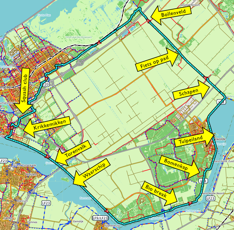 Een kleine roofvogel (ik denk torenvalk) werd door mij opgeschrikt. Bij Zeewolde op het Erkemeder strand stonden chemische toiletten voorzien van toiletpapier. Een ideale plek voor een bio break. Verderop in het Horsterwold waren grote percelen ontbost. Een beetje jammer maar het zal wel een reden hebben, hopelijk iets anders dan te voldoen aan de vraag naar haardhout. Voorbij Zeewolde wordt een schiereiland in het Wolderwijd aangelegd: het Tulpeiland. Het krijgt nu duidelijk vorm. Op de Knardijk stonden weer schapen en sommige lammetjes maakten grappige bokkensprongen. Ook vanaf de Knardijk zijn diverse bollenvelden te bewonderen: geel, oranje, hardroze, helderrood.