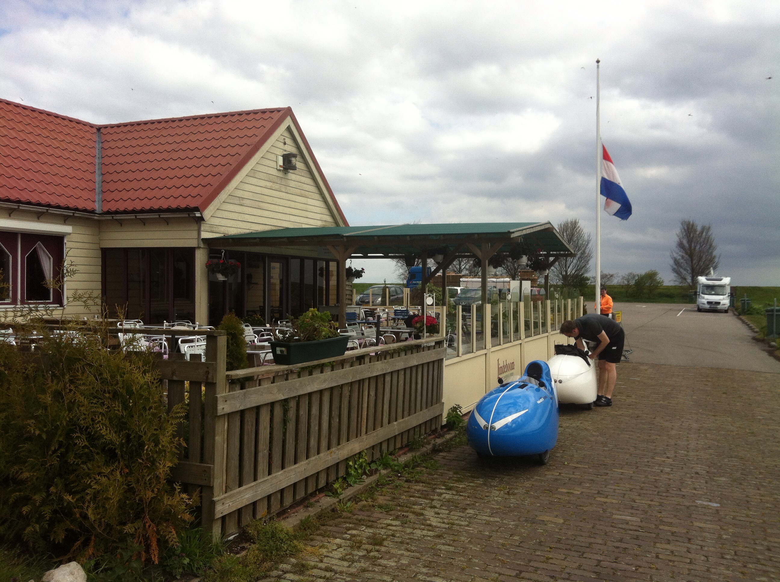 Als astma-patiënt kan ik kiezen tussen de zware bakluchten binnen of de sigarettenrook op het terras. Allebei even slecht. Het zal de eerste en laatste kop koffie bij Checkpoint Charlie zijn, ook al omdat we 15 euro moeten afrekenen. Wel ontmoeten we een aardige fietster die zeer geïnteresseerd is in onze velomobielen. Ze rijdt op een normale trekkingfiets in één dag een rondje Markermeer. Wij gaan er twee dagen over doen. Onze fietsen zitten tot de puntmuts vol met kampeerspullen.  Na de koffie en appeltaart laat de zon zich steeds meer zien.