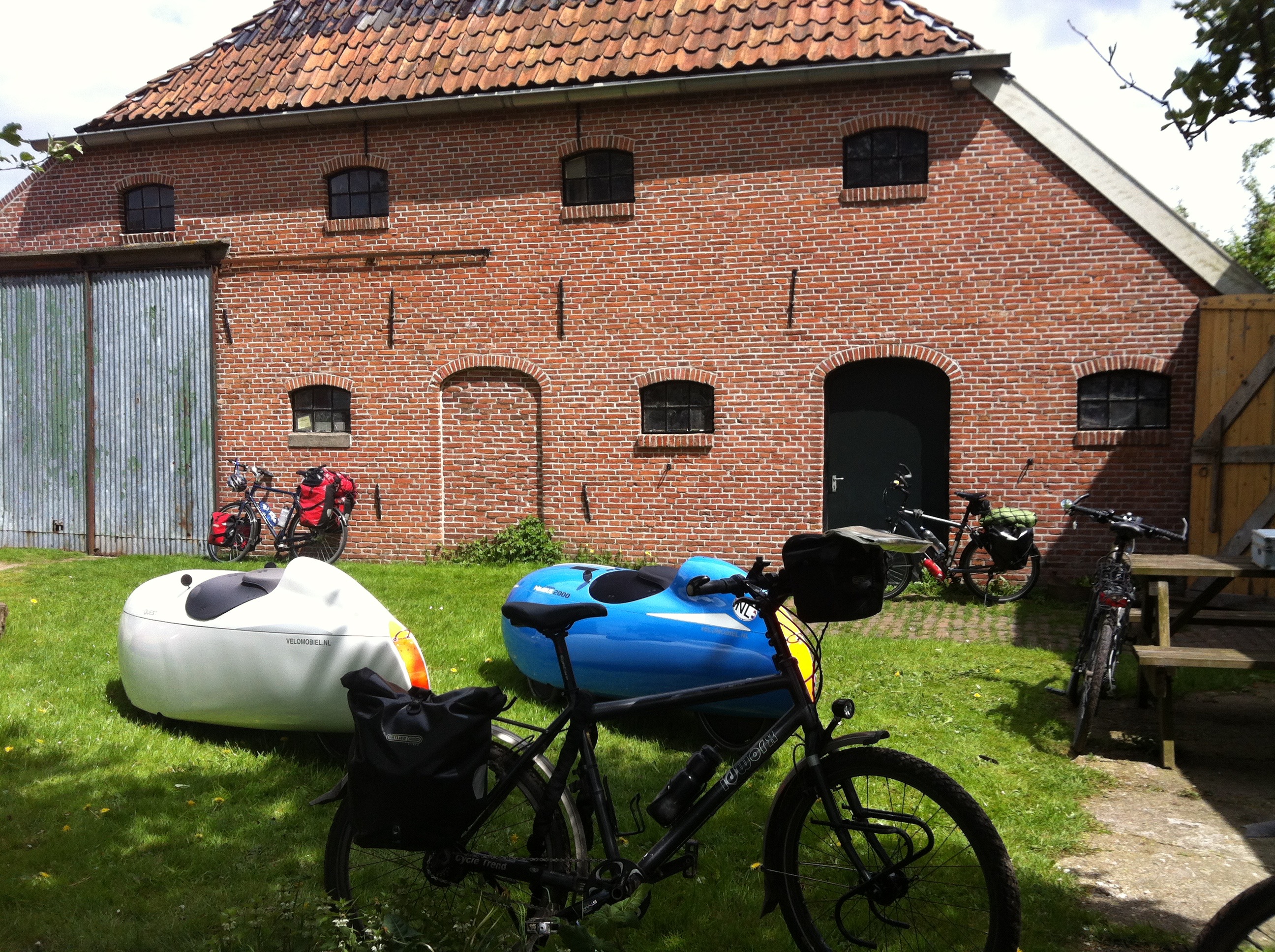 Bij Marten Gerritsen van M-Gineering slaan we ons tentje op in zijn boomgaard. Achter de schuur, uit de wind en in de zon is het nog een beetje te doen. Maar het is toch wel erg koud. Met name de wind is ijskoud. De douche bij Marten is afwisselend kokend heet, dan lauw en eindigt al vrij snel in alleen nog koud water. Naast de boerderij van Marten, die de vervolgcursus fietsreparatie geeft, zit een bed & breakfast. Dat begint met nog een koude nacht in het vooruitzicht steeds aantrekkelijker te worden maar we zijn fietskampeerders dus laten ons niet kisten.