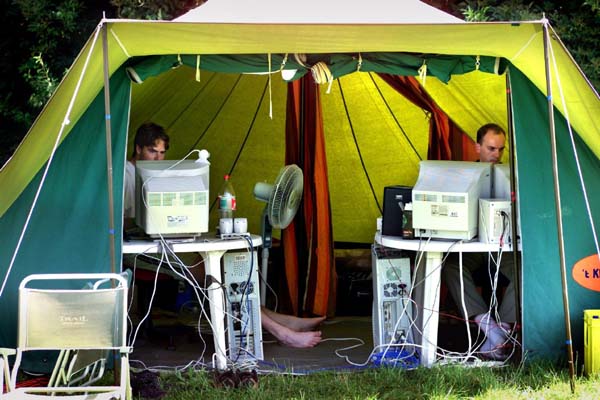 NLD 20010730-BIDDINGHUIZEN: Computerfanaten gaan in hun tent helemaal op in hun hobby. Op het terrein van Six Flags in Biddinghuizen is maandag CampZone van start gegaan. De zogenaamde lanparty is een combinatie van kamperen en spelen op de pc. Via een speciaal daartoe aangelegd netwerk kunnen de deelnemers met hun eigen pc communiceren met anderen en gezamenlijk computerspellen spelen. CampZone duurt tot en met 6 augustus. Zie bericht bin dd heden: BIDDINGHUIZEN-COMPUTERS-PARTY. ANP FOTO/ROBIN UTRECHT