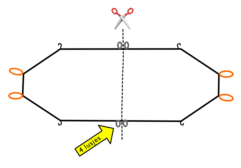 Knip de footprint van de Pulsar 200-tent precies doormidden en zoom af. Maak aan de hoeken van de nieuwe zoom twee stevig vastgenaaide lusjes van het parachuteband (zie onderstaande tekening). Het lusje moet zo groot zijn, dat het elastische koord er doorheen gevoerd kan worden. Hiervoor ging ik naar een lokale kleermaker maar als je iemand in je buurt hebt die een naaimachine kan bedienen is dit zo gepiept.