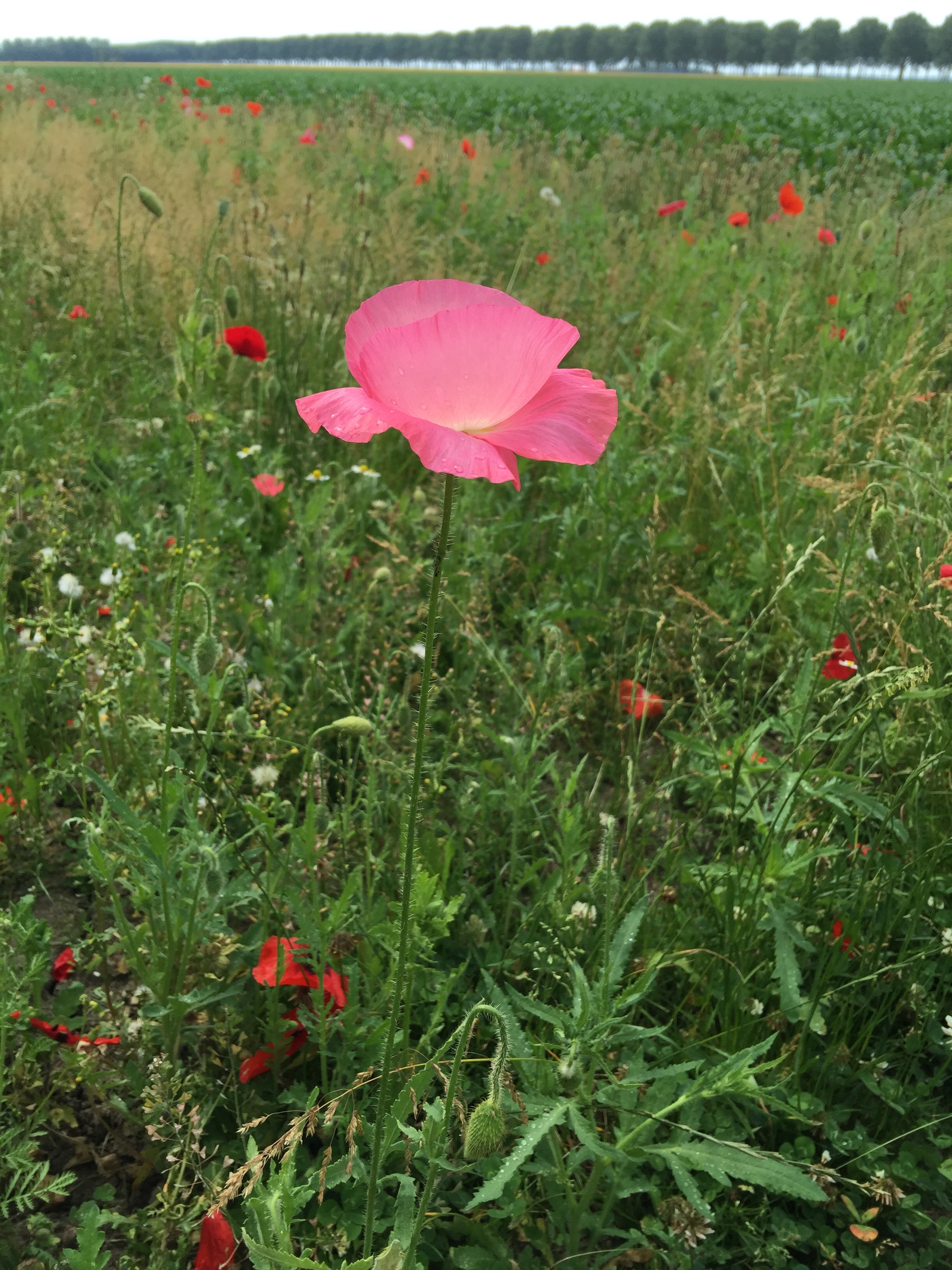 Het is warm en er valt wat regen. Onderweg zien we roze klaprozen in de berm.