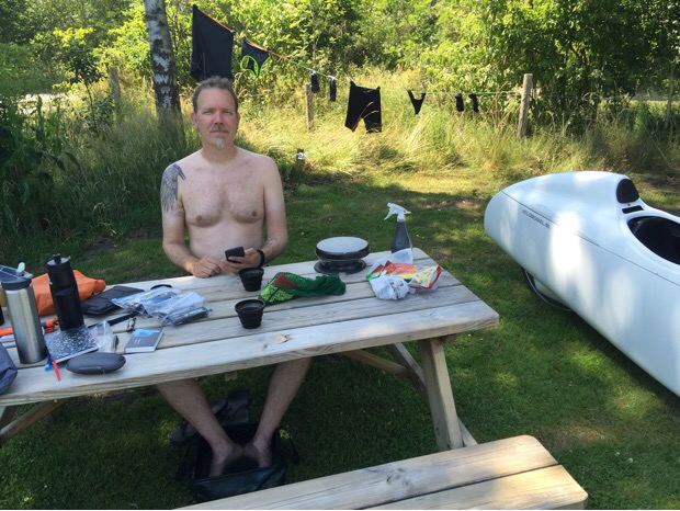Om 11.30 waren we op de camping na eerst de Havelterberg te hebben bedongen. In het opvouwbare wasbakje van Ortlieb eerst de fietskleding uitgespoeld. Daarna vonden we al snel een tweede praktisch nut voor het wasbakje: een heerlijk verkoelend voetenbadje!