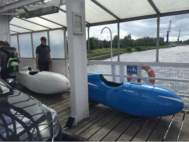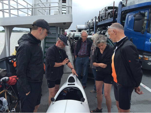 Op de pont over de Elbe kwamen we in gesprek met andere fietsers die weer van alles wilden weten over onze velomobielen. Hoe hard ie gaat, waar de kampeerspullen zitten (vaak denken ze in de neus), of we versnellingen of Rohlofnaaf hebben. Iedereen was onderweg naar Denemarken.