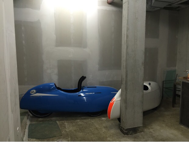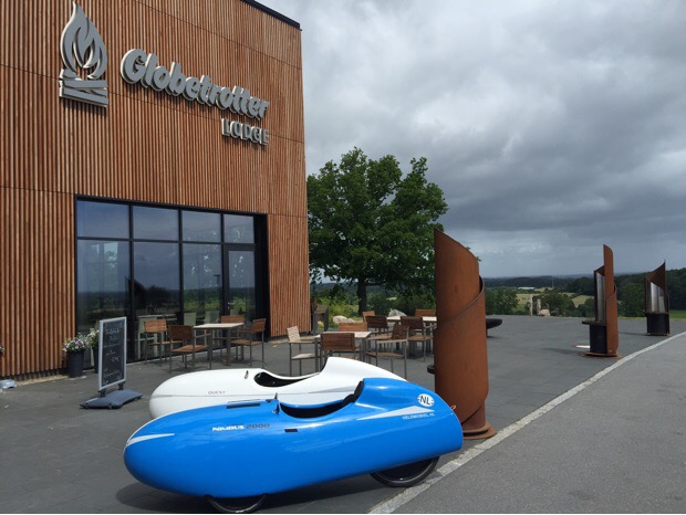 Omdat we vanwege de storm niet kunnen fietsen hebben we onszelf ingecheckt in het meest dichtstbijzijnde hotel. Lang leve booking.com! Voor het hotel moesten we eerst naar 98 meter hoogte steil klimmen, deels over een onverhard pad waar onze Almotion achterband doorslipte. Het schitterende hotel ligt bovenop een heuvel, de Aschberg! De velomobielen zijn stormvast gehuisvest in een technische ruimte van het hotel.