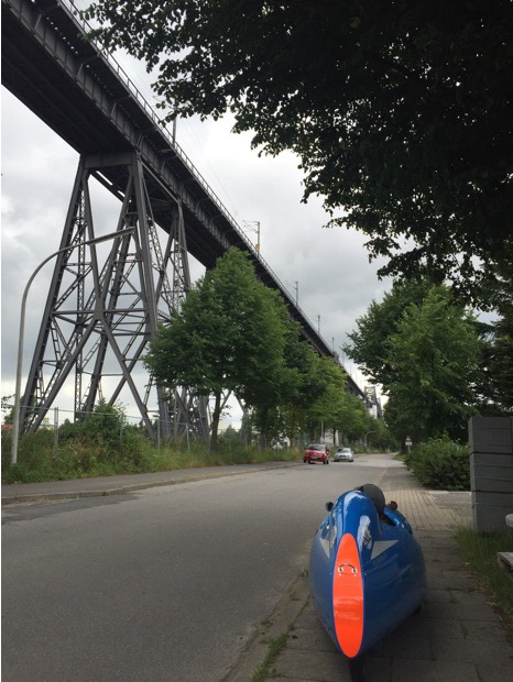 Itzehoe bleek een pittige beklimming. Bij Rendsburg ligt een hele hoge stalen spoorbrug. We staken hier het Noord-Oostzeekanaal over met een zweefpont die onder deze hoge spoorbrug hangt. Heel bijzonder. Een paar tieners op de Schwebefährt vroegen me verbaasd hoe je uit zo’n fiets kon komen (ik had de schuimkap op). Dachten dat de fiets wel duur zou zijn (klopt) en vonden ‘m helemaal te gek (klopt ook)!