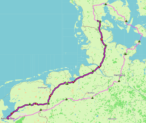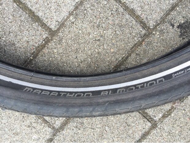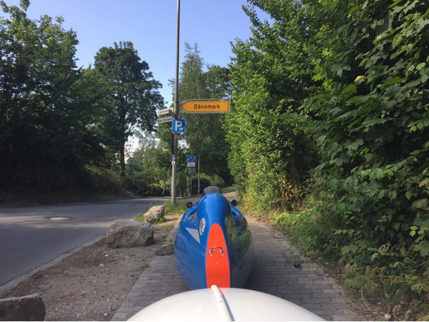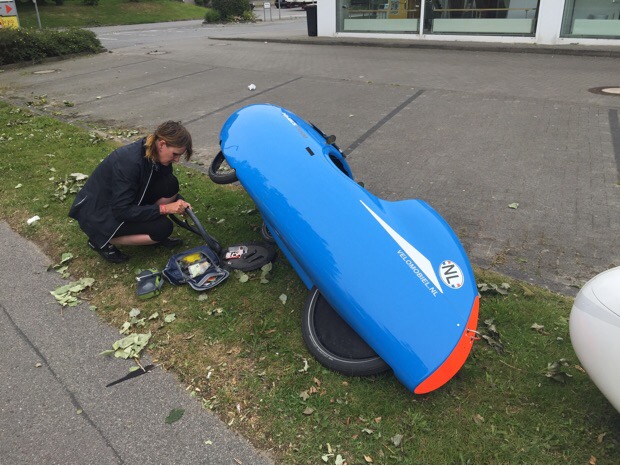 In het drukke Flensburg daarom gezocht naar een fietsenwinkel die op zaterdag na 15.00 uur nog open was. Lang leve Google Maps! Bellen. Ze zouden een Marathon Plus 40-559 hebben. Adres invoeren in de GPS en na een paar steile klimmetjes stonden we voor de deur. Heel Duitsland loopt uit voor onze velomobielen “so etwas habe ich noch nie gesehen!” maar bij het Fahrad Station was er nul interesse. En alleen een 40-559 van Vaag Merk. 26 Inch, dat was maar een rare maat (hele winkel stond vol MTB’s). Vouwband? Wat is dat? Genoegen genomen met een Schwalbe Range nogwat 47-559 en die er direct omgelegd. Gelukkig loopt die ook al niet meer aan, toch 8 mm smaller dan de Almotion.