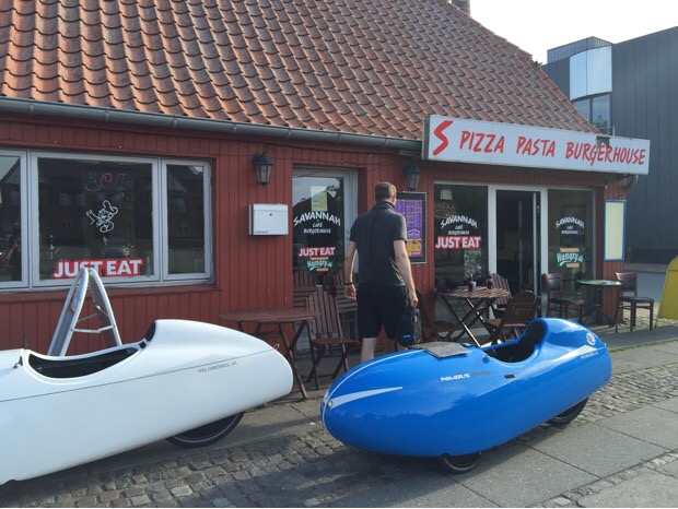 Door het gedoe met de banden eerst een pizza in Aabenra voordat we doorfietsen naar de teltplads.