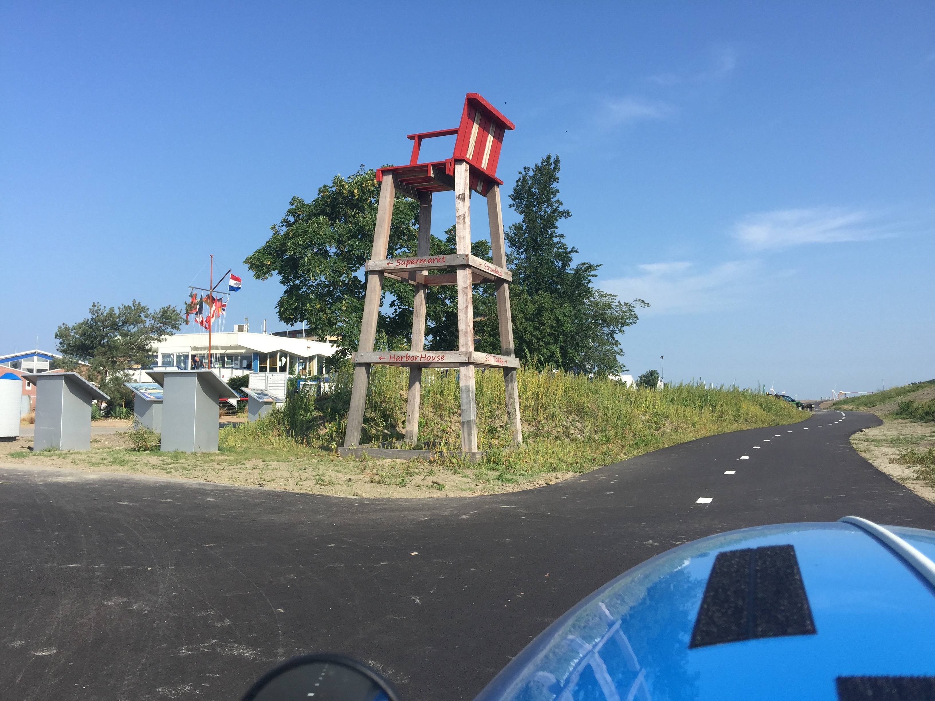 Het tochtje wat ik reed bedroeg slechts 46 kilometer, terwijl de uitgezette route 42,5 kilometer was. Ik reed twee keer verkeerd. Eén keer bewust. In de nieuwe wijk in aanleg in de buurt van het Almeerderzand, Duin, negeerde ik omleidingsborden omdat ik een prachtig nieuw fietspad van vet zwart asfalt zag dat ik wilde verkennen. Zou het al helemaal doorlopen? Helaas nog niet, waardoor ik moest keren op het pad. Langs dit pad staan leuke wegaanwijzers in de vorm van bovenmaatse strandstoelen. Ze wijzen onder andere naar de haven en het strand langs dit pad.