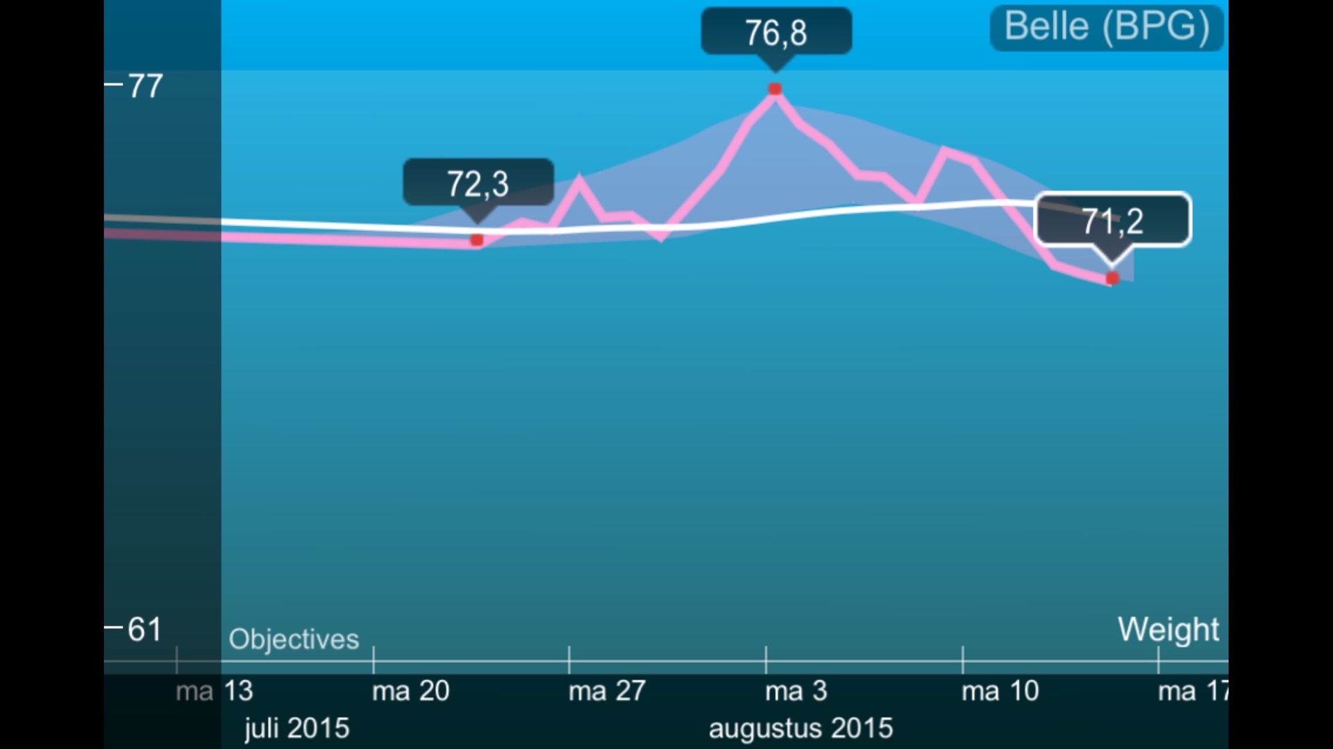 Een piek in gewicht direct na thuiskomst fietsvakantie (screenprint Withings Wi-Fi weegschaal app)