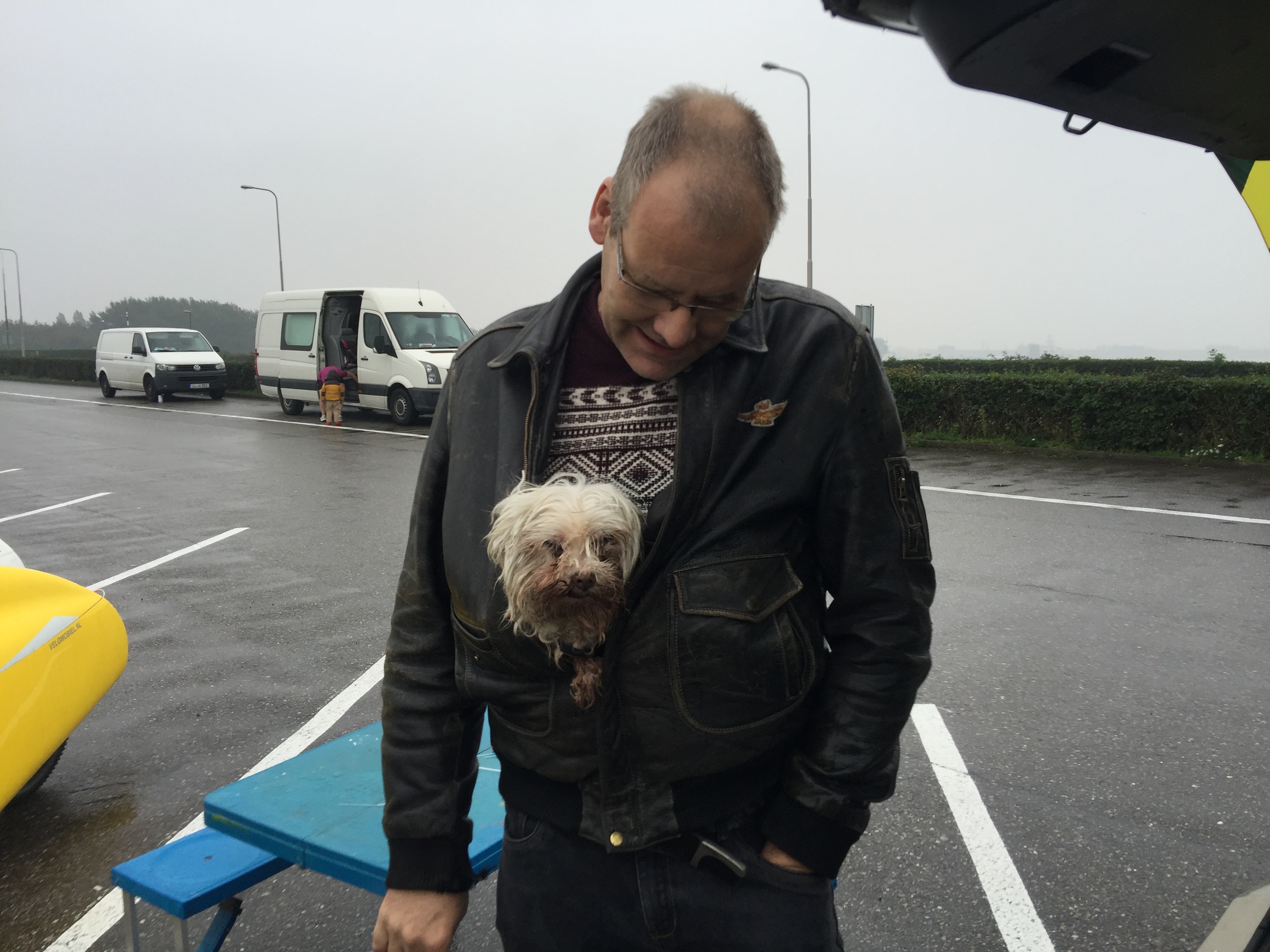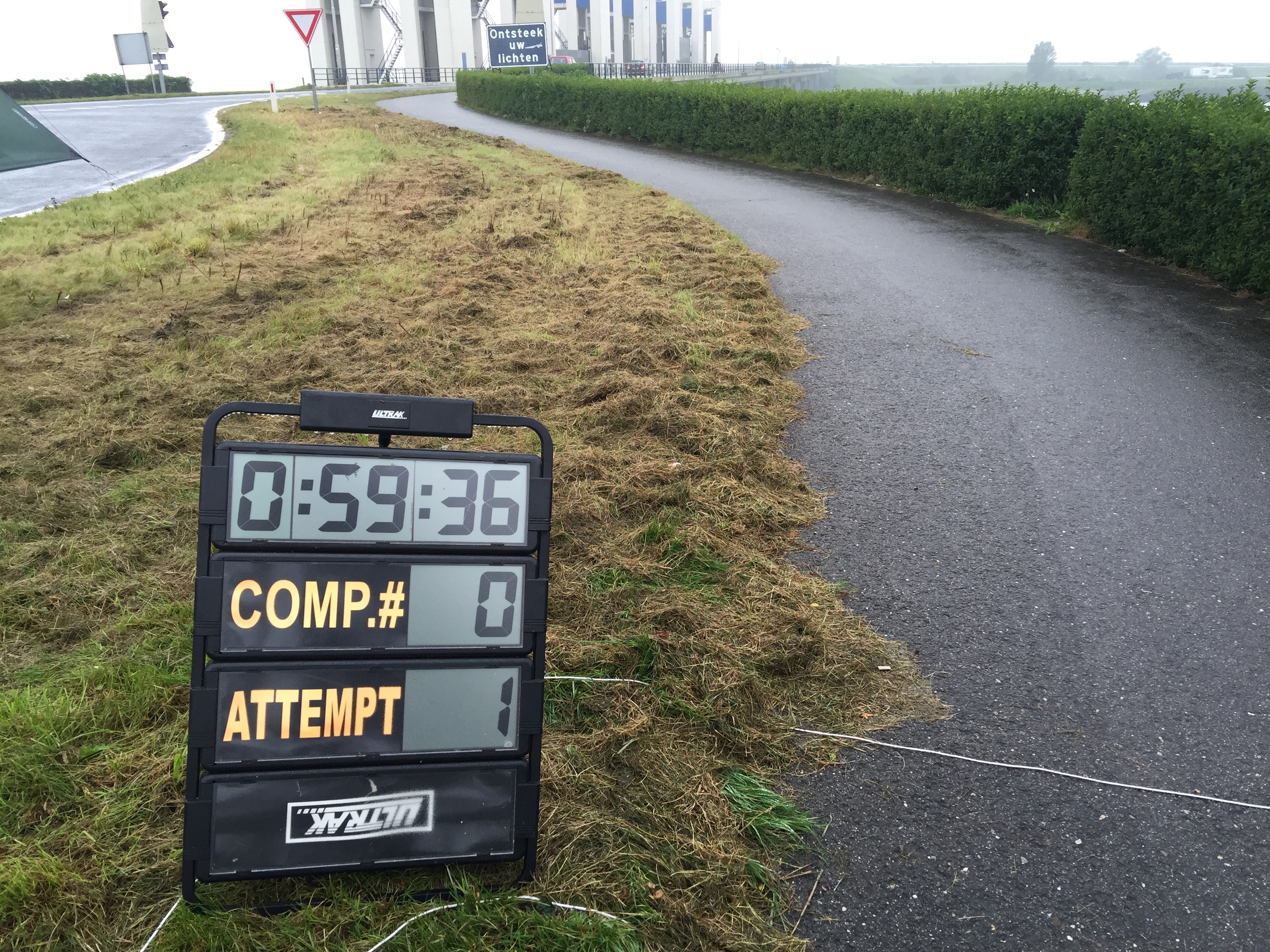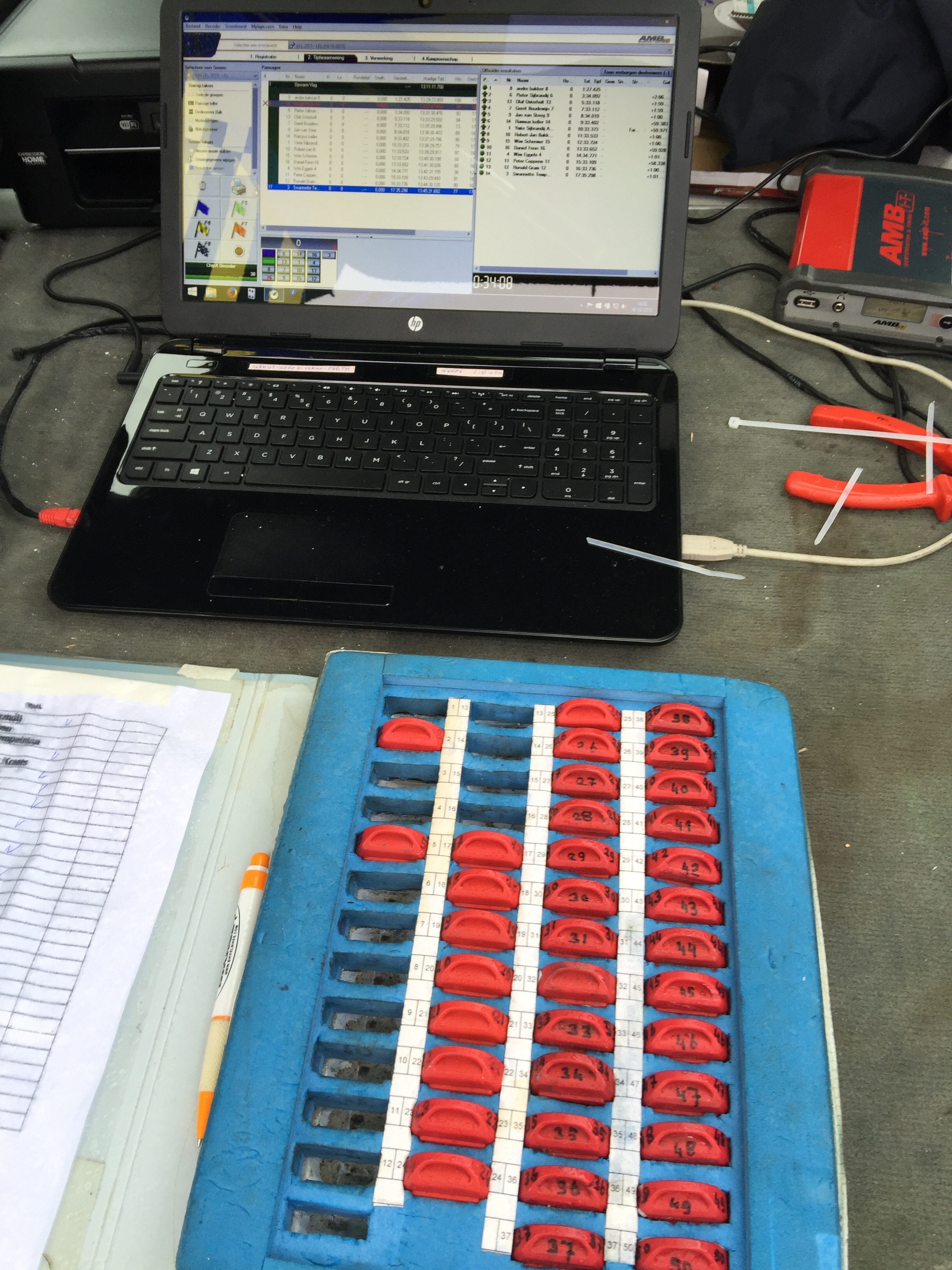 De reserve wedstrijdcomputer en transponders bij Gerard in de achterbak
