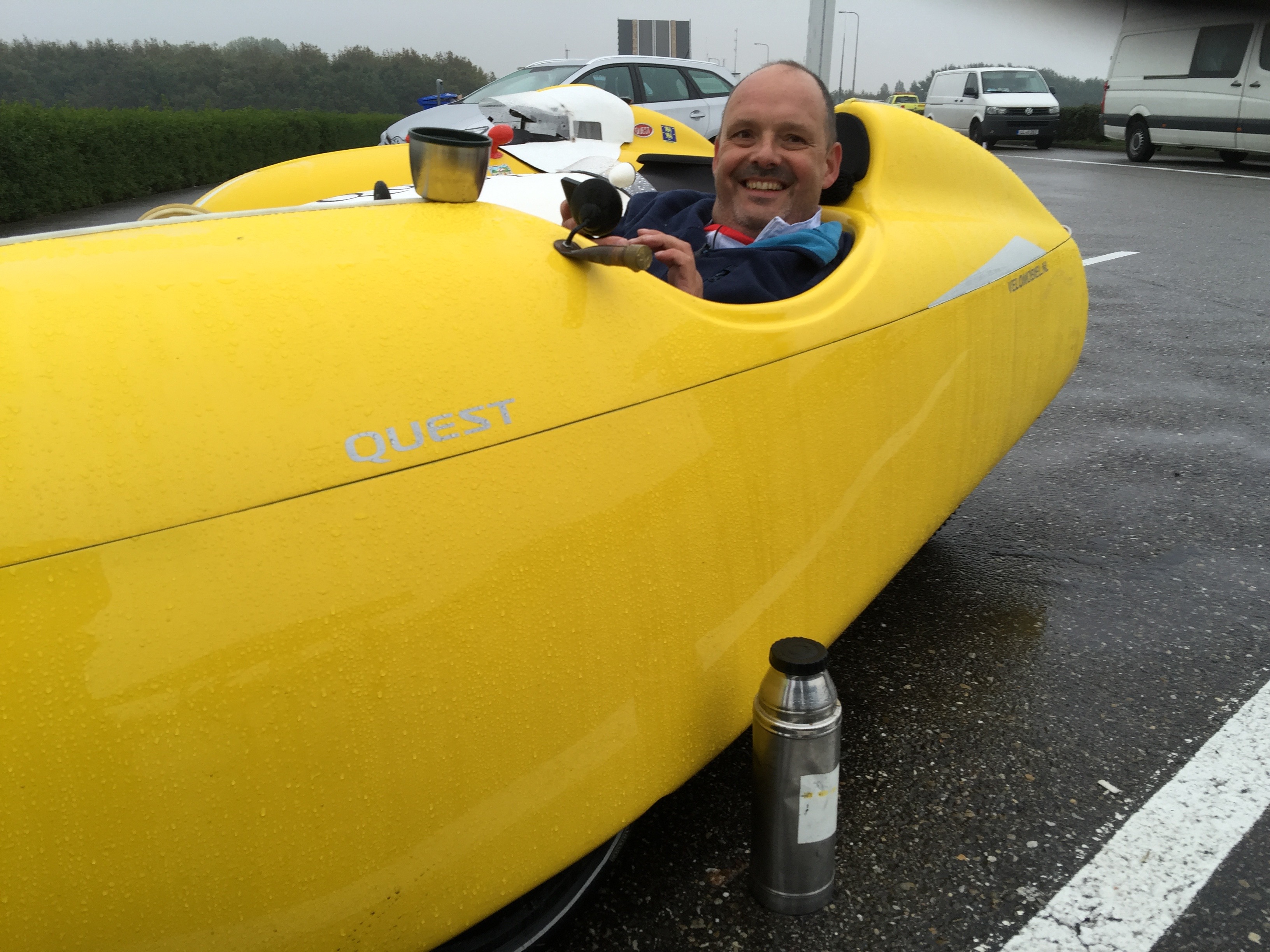 Matthijs houdt zich warm met zijn velomobiel en warme koffie