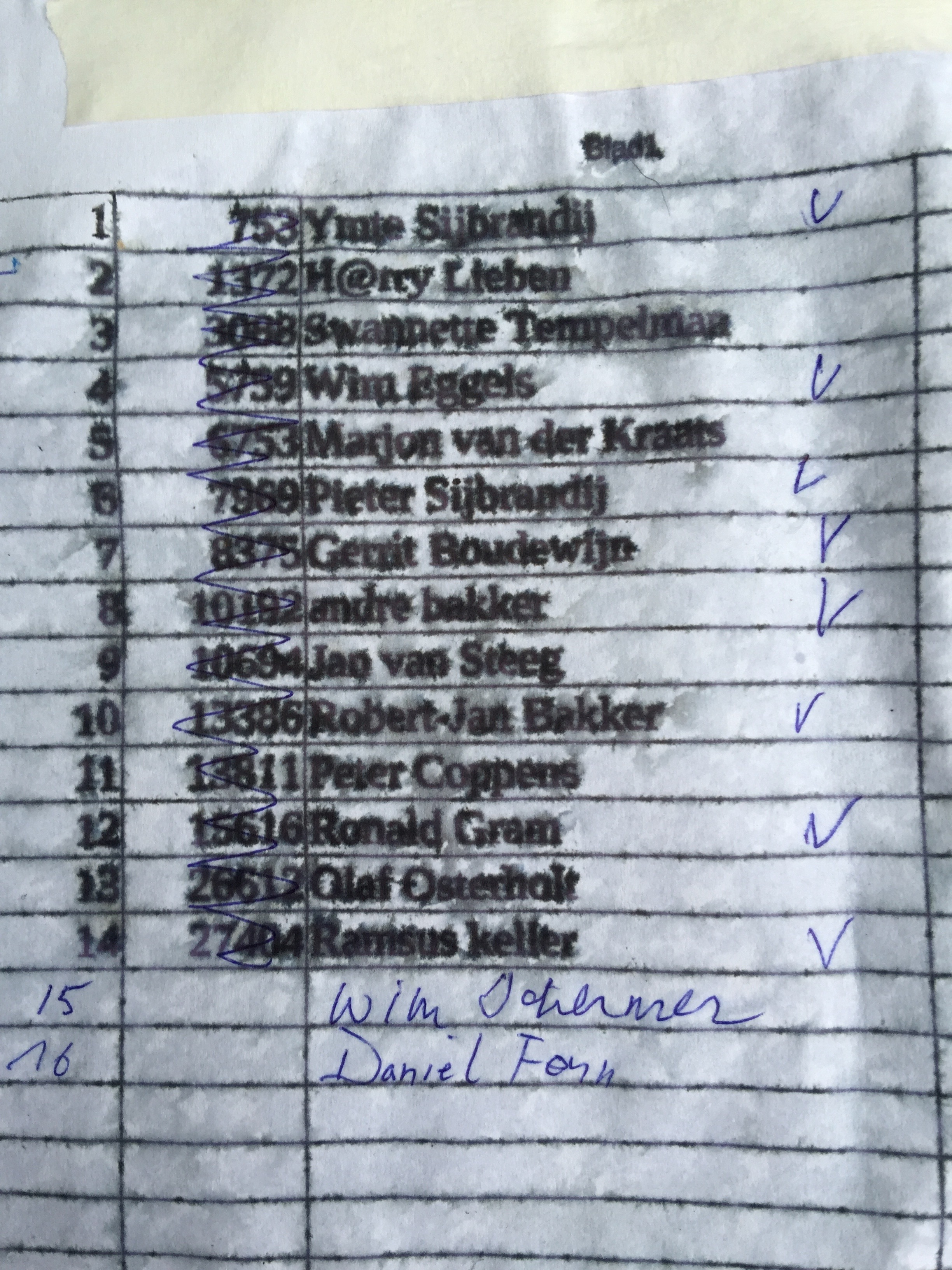 De verregende deelnemerslijst. Nog niet afgevinkt maar wel van de partij: Swannette, Peter, Jan en Olaf.