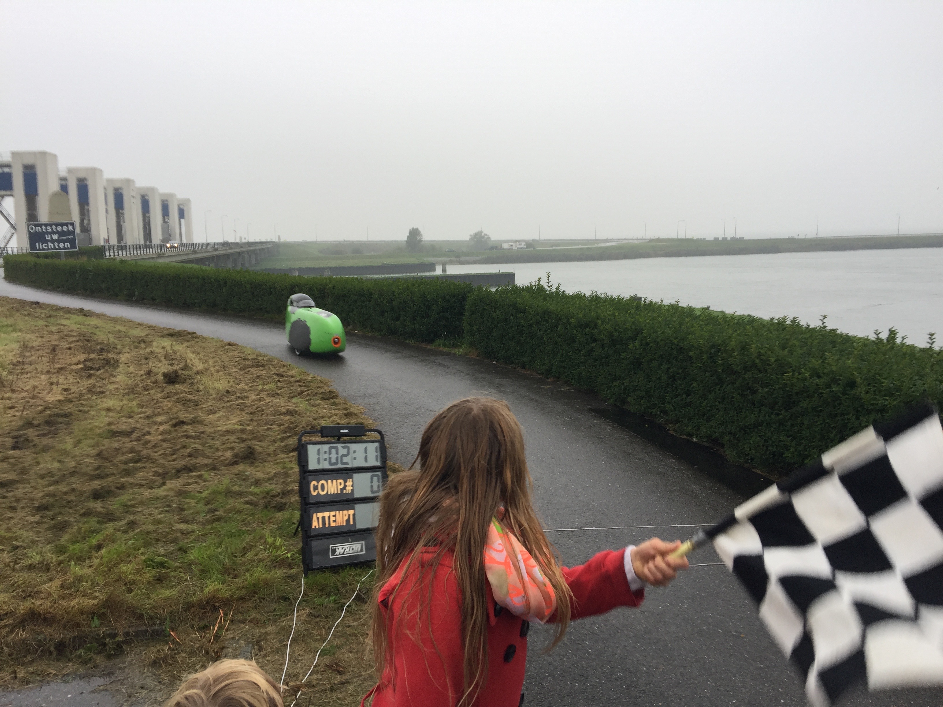 Dochter Anna vlagt met de finishvlag voor haar vader (Ymte)