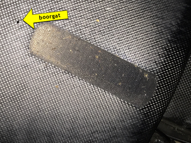 Maar goed, die natte broek, dat is geen prettig gevoel. Dus daar wilde ik vanaf. Met een staalboortje maat 3 heb ik een gat in de bodem van het zitje geboord. Eerst even een plasje water op de stoel gieten om het diepste punt te kunnen bepalen. Een dun snijplankje onder het zitje gelegd om de bodem van de fiets te beschermen tegen een eventueel doorschietende boor en vervolgens boren. Resultaat: voortaan kan het vocht uit de kuil in de stoel weglopen en blijft de zitting droog. Kan er één microvezeldoekje minder mee.