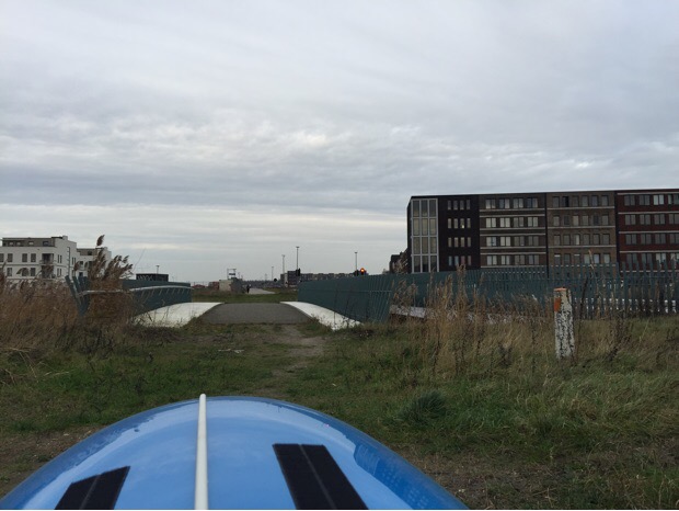 Onder de A6 door kom je terecht in Duin, een wijk in aanleg. Hier kan je de dijk langs het water al enige tijd niet volgen vanwege de bouwwerkzaamheden. De alternatieve route door Duin wordt aangegeven met spaarzaam neergezette wegomleidingsbordjes met ‘8’ erop. De route door Duin loopt anders dan voorheen en ik verdwaal. Ik kom terecht in stadsdeel Poort, ook nog in aanleg. Dat betekent: bruggen die nog niet zijn aangesloten op infrastructuur, fietspaden die plotseling ophouden en bobbelige bouwwegen. Met moeite vind ik de weg naar de dijk terug, via een dreef voor auroverkeer want een fietsroute kan ik niet ontdekken.