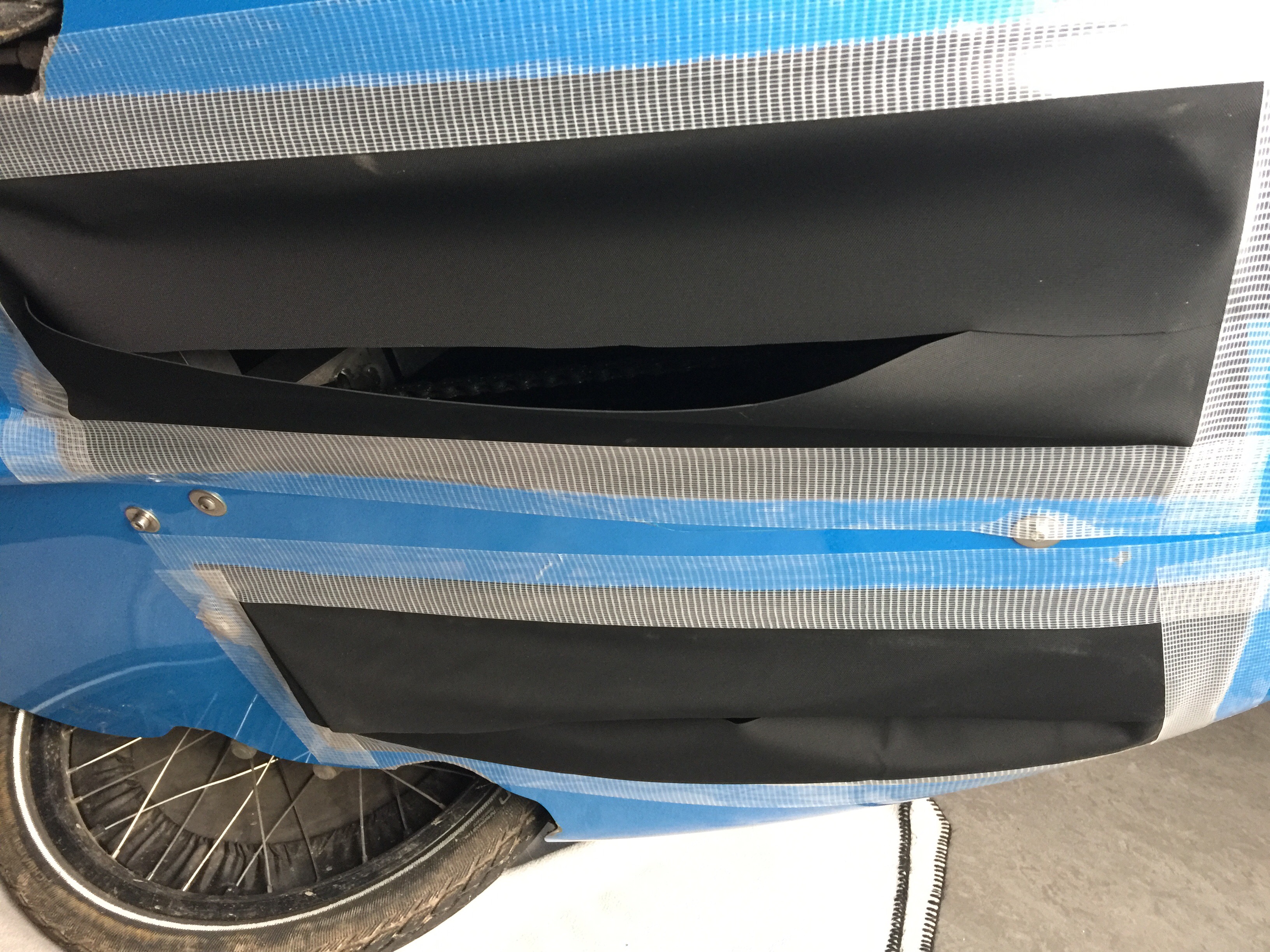 Een andere tip die ik kreeg, van Marijn Kools, was EPDM-rubber gebruiken voor de afdichting. Dit is rubber dat gebruikt wordt op daken en erg slijtvast zou zijn. Online is hier moeilijk aan te komen (op veel sites alleen grote hoeveelheden of erg dure leveringskosten) maar ik vond het opeens bij Intratuin, waar het verkocht wordt als vijverfolie. Het nadeel van EPDM is dat het niet goed aan duct tape wil blijven kleven, net als het geval is met siliconen (en parachuteband, by the way). Hierdoor lieten de EPDM-stroken al vrij snel los. Je zou het dan op dezelfde manier moeten verwerken als de siliconenstroken: eerst rondom tape er aan vastnieten en dan deze tapeomzoming vastplakken aan je velomobiel.