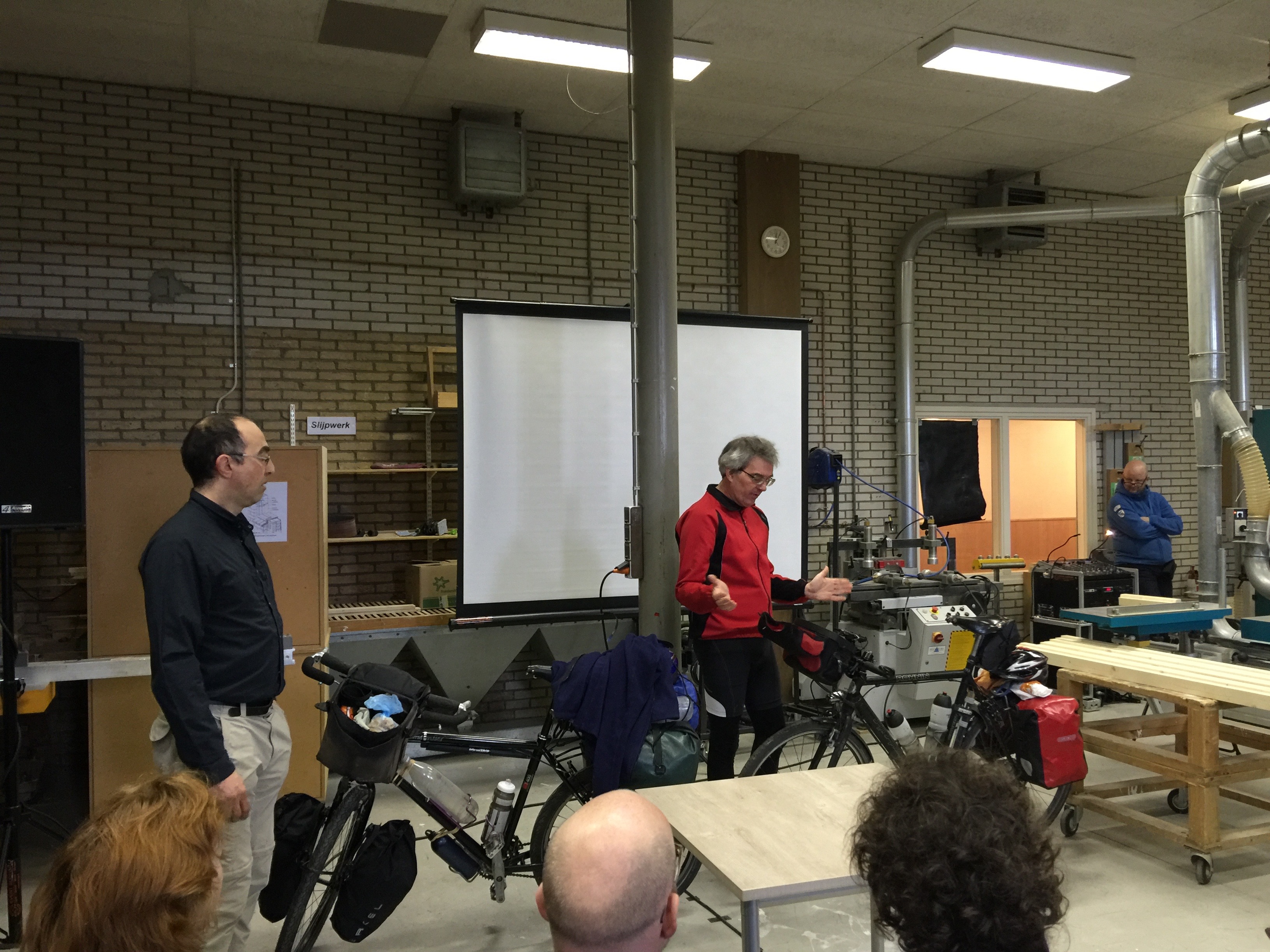 De heren gaven de volle zaal diverse kampeertips. Leon stopt alles in gebruikte lensvloeistofflesjes die onverwoestbaar blijken te zijn. Had Bert vorig jaar zijn reservekleding nog mee in een boterhammenzakje (dat hij voor de zaal met ongelovigen moest uitpakken om te bewijzen dat er echt een broek en een overhemd in zaten), inmiddels zit zijn kleding in een vernuftig compressiehoesje van Eagle Creek. Hij kookt op een White Box Stove. Licht, maar op deze brander kan je niet iets laten sudderen en moet je oppassen voor de vlam in de pan. Bert navigeert op zijn mobiele telefoon met behulp van de app OsmAnd Maps, omdat hij niet een apart gps-toestel wil meenemen. De weinige foto’s die hij maakt, maakt hij ook met zijn telefoon. Leon fietst op papieren kaart en neemt naast een gms een aparte digitale camera mee.