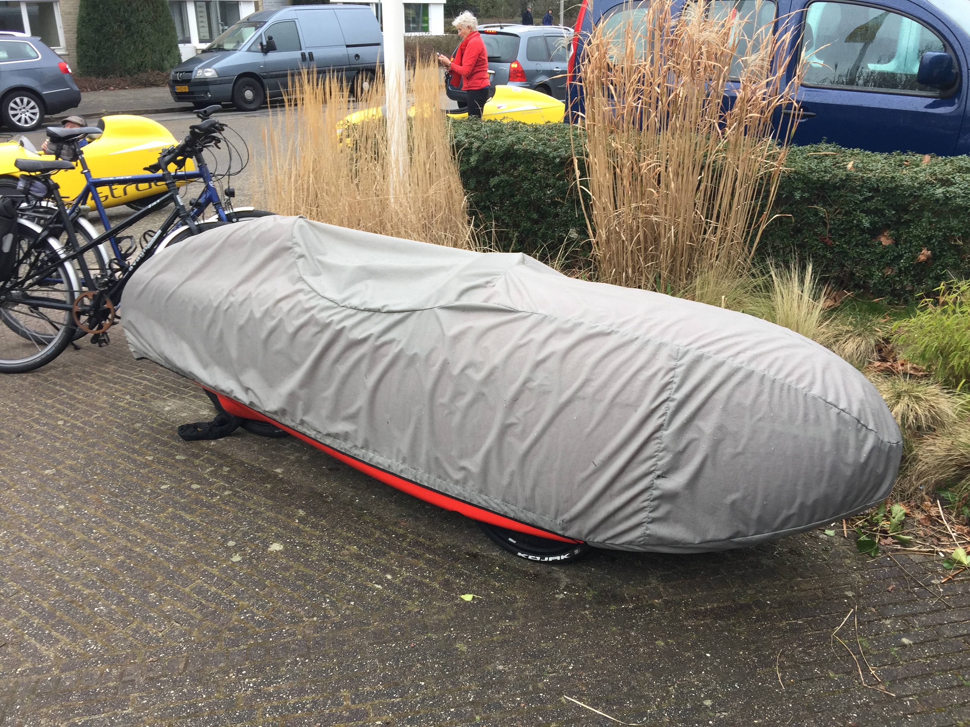 Elly en Jules waren weer met hun velomobielen gekomen en iemand had zijn rode Quest onder een mooie hoes van Radical Design voor de deur geparkeerd.