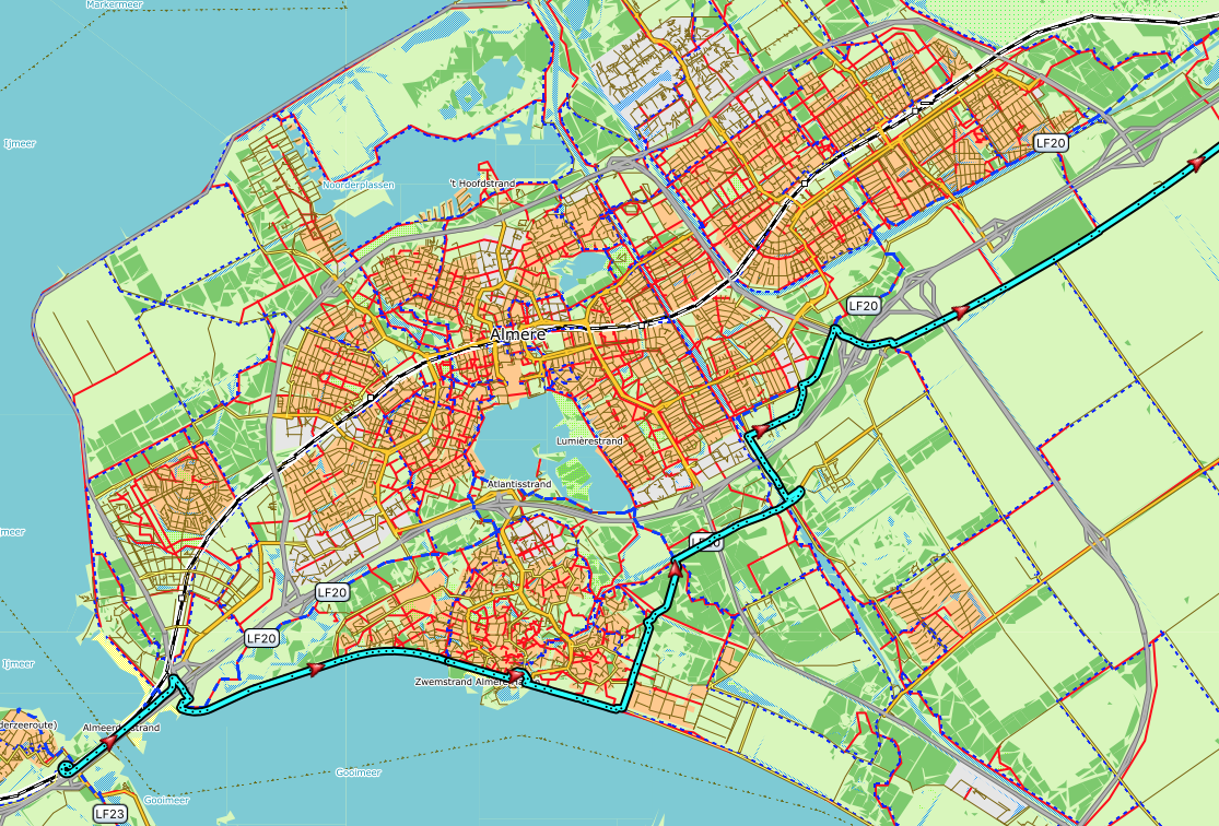 De route langs het Markermeer is in principe nog wel te doen maar je zult ongetwijfeld verdwalen in Duin, een wijk in aanleg. Er zijn hier omleidingsbordjes gemarkeerd met ‘8’ maar ze zijn wat spaarzaam neergezet. De route door het Kromslootpark is ook geen optie meer (het Blanchardpad is verdwenen maar staat nog wel op Google Maps en de nieuwste kaart van OpenFietsmap), in verband met de werkzaamheden aan de A6. Je kan het beste zuidelijk rijden via Zilverstrandweg en Gooimeerdijk.