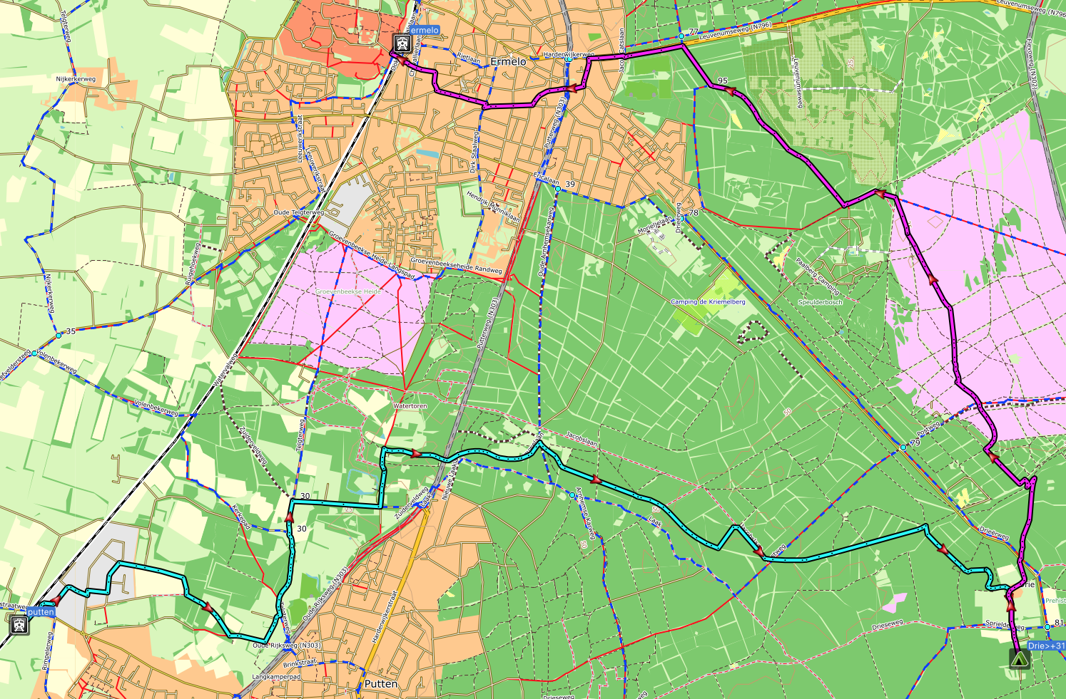 Met een zelfgemaakte route liepen we van station Putten naar natuurkampeerterrein Drie en de volgende ochtend liepen we naar station Ermelo. Met twee rugzakken van 50 liter waar we zelfs nog stoeltjes en een tafeltje in hadden weten te proppen.