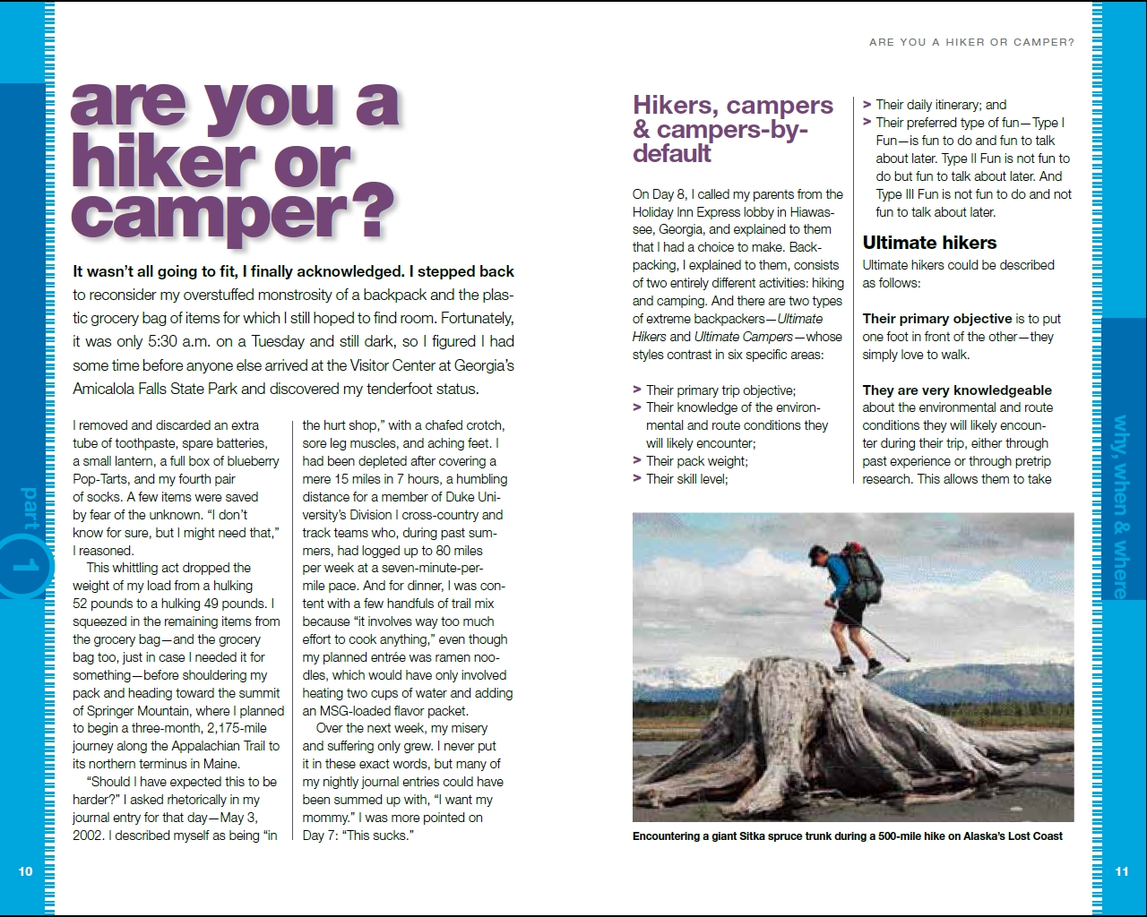 De kampeerder brengt veel tijd door op de camping en doet aan activiteiten als vissen of barbecuen. Hij maakt een korte wandeling in de buurt, blijft een paar dagen op dezelfde camping. Als hij wel doorreist, doet hij dat na een uitgebreid ontbijt op de camping, waardoor minder tijd overblijft om te reizen. De trekker daarentegen is het liefst zoveel mogelijk onderweg en zet alleen zijn tarp op om te slapen. ’s Ochtends breekt hij zijn kamp in een mum van tijd op en gaat op pad. Tijdens zijn eerste pauze, als de eerste kilometers er al opzitten, maakt hij koffie en eet hij zijn ontbijt. Zo gaat het ook met het diner, na het avondeten worden nog flink wat kilometers gemaakt, voordat een plek voor de nacht gezocht wordt. In de Verenigde Staten een hele goede strategie, om niet te koken in de buurt van waar je slaapt, zo houd je beren beter weg bij je tent. Op deze manier zitten er veel loopuren in een dag en kan iedereen flinke afstanden afleggen, ook met een rustig tempo. Wat daarbij ook helpt, is een ultralichte uitrusting.