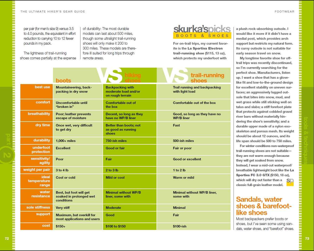 De The Ultimate Hiker’s Gear Guide vertelt je niet alleen dat je een fleecetrui moet meenemen in plaats van een katoenen sweater maar ook waarom en waar je op moet letten bij de aanschaf van fleece. Er wordt altijd wel aanbevolen hoeveel waterkolom een tentdoek minimaal zou moeten hebben, maar die cijfers blijven altijd abstract. Skurka legt ook uit hoeveel waterkolom druk tentdoek bijvoorbeeld krijgt te verduren in een regenbui tijdens storm (7.000 mm). Het is daarmee het meest diepgaande boek over kampeeruitrusting dat ik tot nu toe ben tegengekomen. Ook als je geïnteresseerd bent in het terugbrengen van het gewicht van je bagage, zul je genoeg nieuwe ideeën krijgen dankzij dit boek.