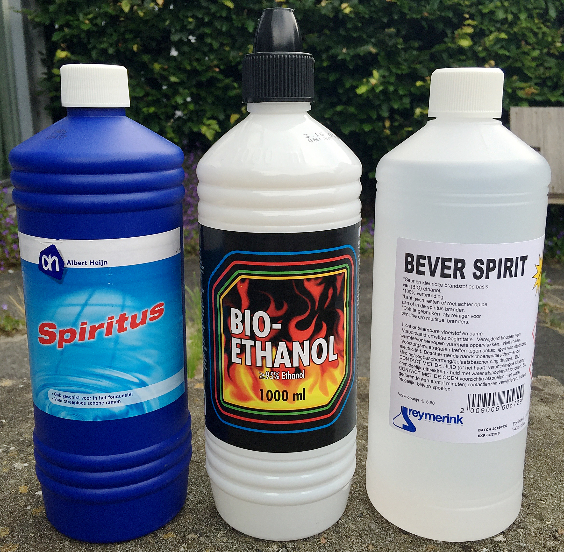 Je kan een bijna net zo goede brandstof krijgen als Bever Spirit (99 procent ethanol), voor minder dan een derde van de prijs. Deze Espar Bio-Ethanol bevat ≥95 procent ethanol en wordt verkocht bij Action. Het eigen merk spiritus van Albert Heijn bevat het laagste percentage ethanol: 85 procent. In de test keken we hoe snel deze verschillende merken spiritus een liter koud water aan de kook kreeg.