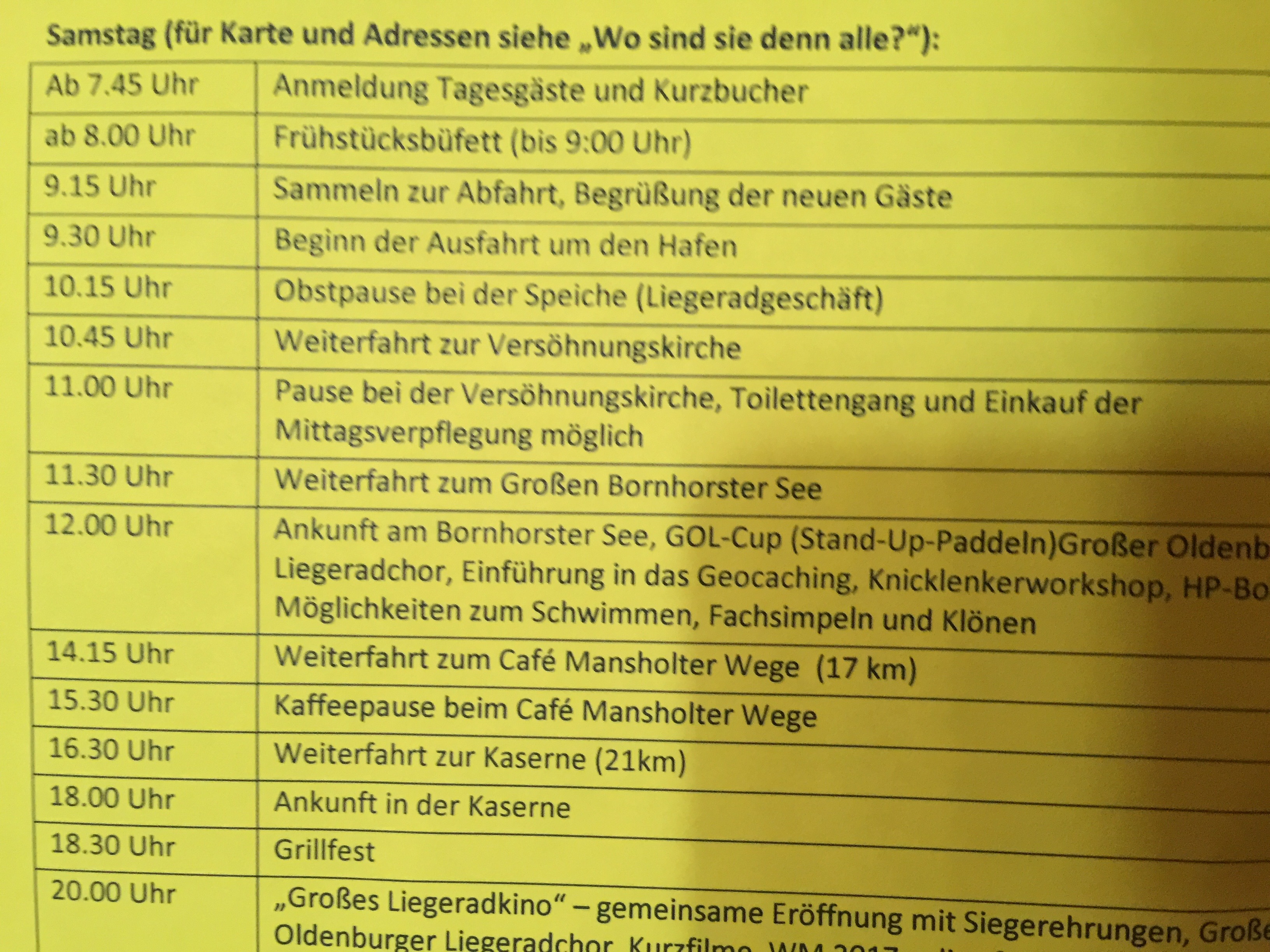 We waren niet degenen die het verste waren komen fietsen. De avond ervoor had ik al met een koppel uit Bonn zitten praten dat meer dan 330 kilometer had gefietst. De winnaar was iemand die 700 kilometer had gefietst. Er werden daarna nog vele prijzen uitgereikt, het koor zong een leuk lied (ik hoop dat de tekst nog beschikbaar komt) over al het ligfietsleed, er werden korte toneelstukjes opgevoerd die volledig aan ons voorbij gingen (Duitse woordgrapjes, moeilijk te volgen) en de film was uiteindelijk een montage van foto’s en filmpjes van de dag, hopelijk komen die eerdaags ook beschikbaar op de site van de Oldenburger Liegeradgruppe.