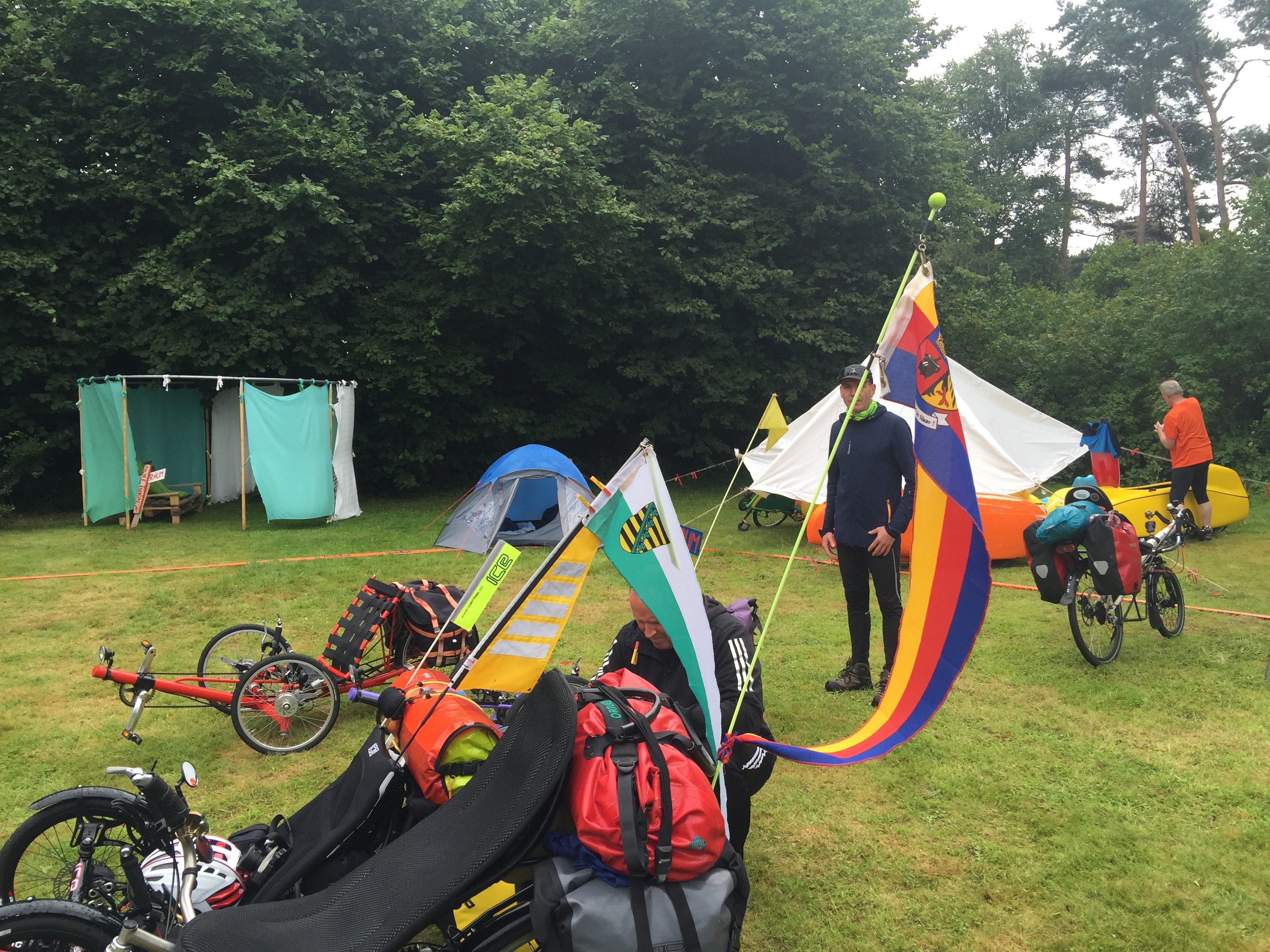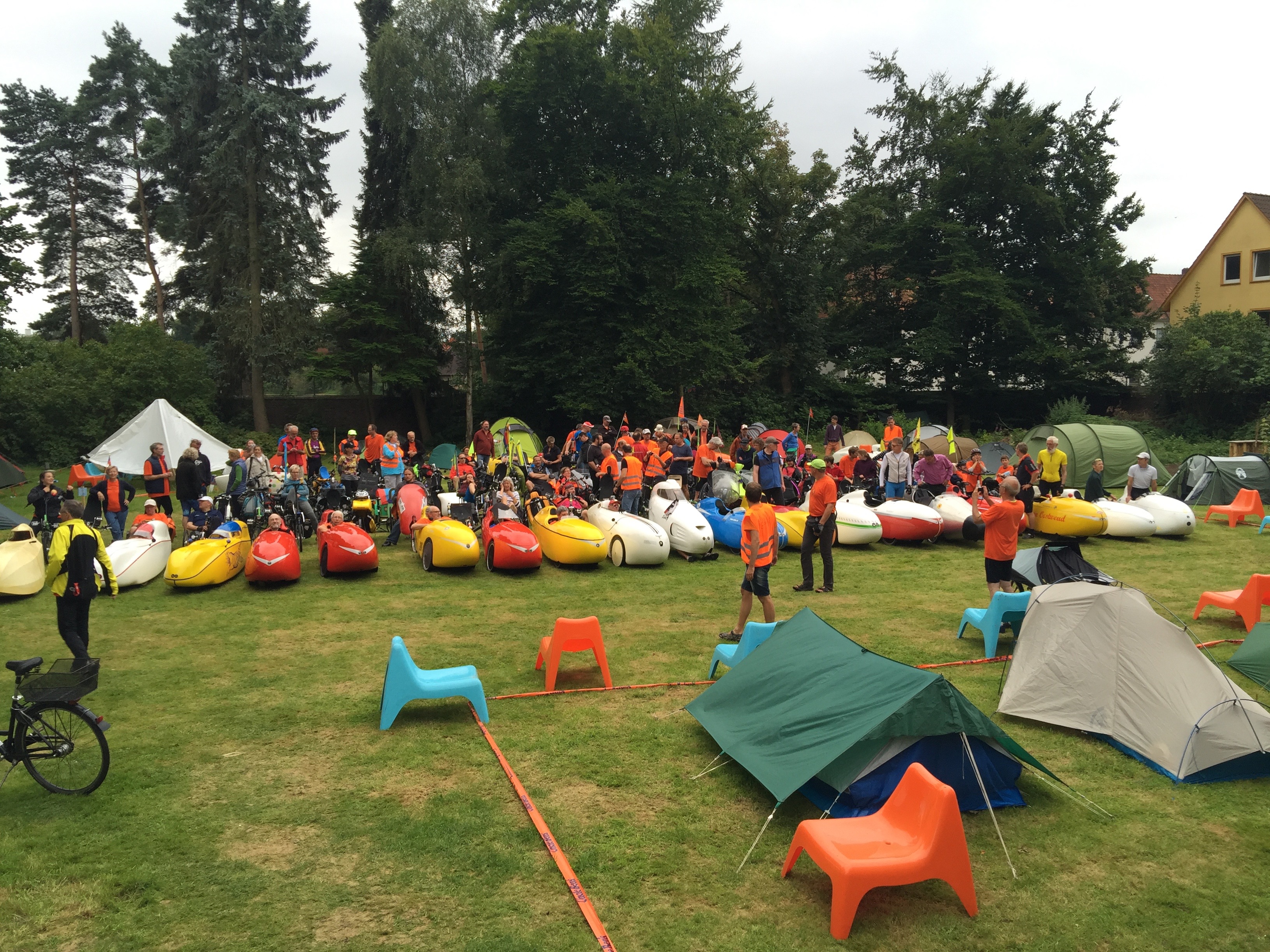 Er zijn kunstzinnige onderdakjes gemaakt waar je met een groepje enigzins droog buiten kunt zitten. Opvallend is dat de meeste fietsen open ligfietsen zijn. Misschien logisch, gezien het glooiende Duitse landschap en de smalle fietspaden. Ook zien we diverse ligfietsen met elektrische ondersteuning. De GOL wordt maar eens in de vier jaar georganiseerd.
