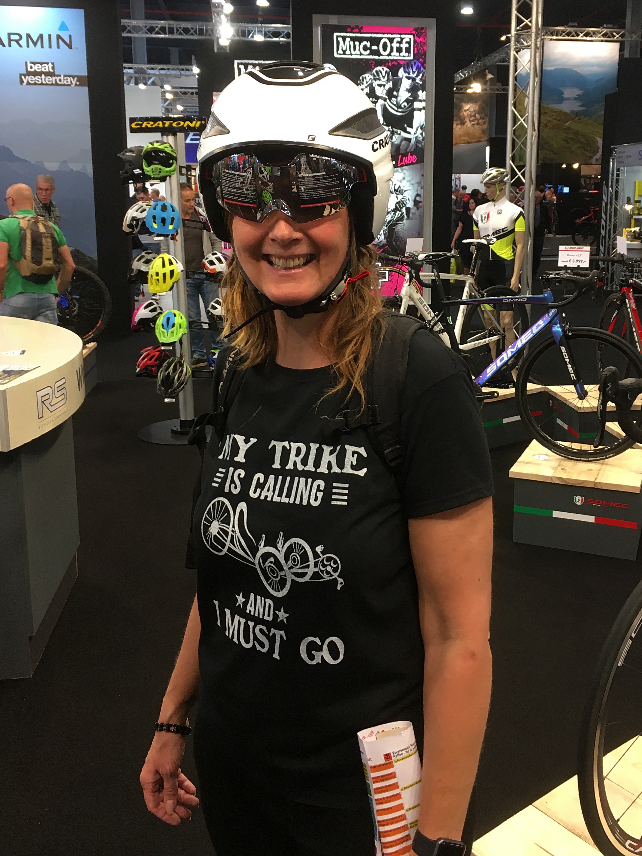 Bij de stands met helmen vragen we naar helmen voor speed pedelecs, die vanaf 1 januari verplicht zijn (of nu al als je al met geel kenteken rijdt). Pas bij de vijfde stand met helmen hoef ik niet wéér uit te leggen wat een speed pedelec is (een fiets met elektrische ondersteuning tot 45 kilometer per uur). Trots laat de standbemanning de eerste helm zien die “speciaal ontwikkeld” is voor de speed pedelec: de Cratoni Vigor. Er zit een keuring op voor motorhelmen (ECE-R 22.05) en ik krijg het al warm als ik naar het ding kijk. Onder de voering (!) van de helm zitten in het foam weliswaar luchtkanalen maar het aantal ingangen is beperkt en de helm sluit ook helemaal over de oren. Hij heeft ook geen draaiknop om de pasvorm goed in te stellen en zit niet lekker. Meer geschikt voor op een scooter, lijkt me, helemaal als ik later de prijs en gewicht opzoek (EUR 249,- en 700 gram).