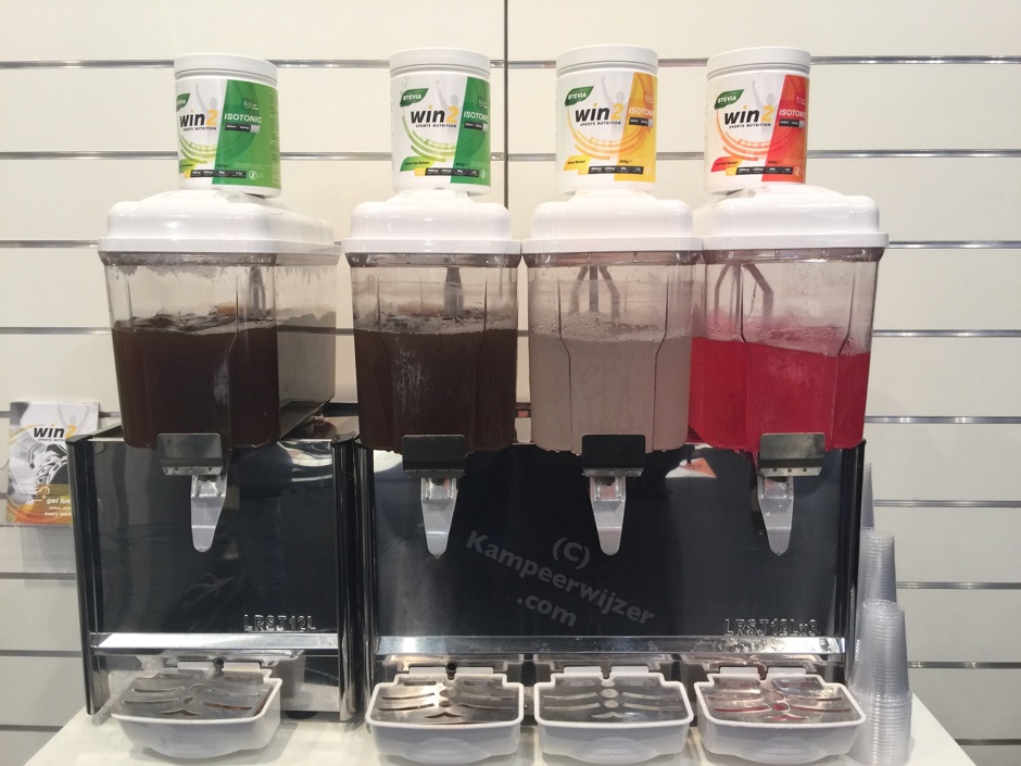 Veel stands met reepjes en drankjes, zoals PowerBar maar ook onbekendere merken zoals Win2. De isotone limonades met elektrolyten staan in diverse smaken op de toonbank om uit te proberen. We vinden de PowerBar Electrolyte Tabs wel interessant: de verpakking is veel kleiner dan de Isostar tabletten die we normaal meenemen en één tablet is precies de juiste dosering voor een bidoninhoud: 750 ml.